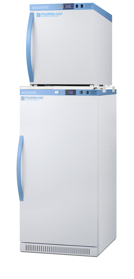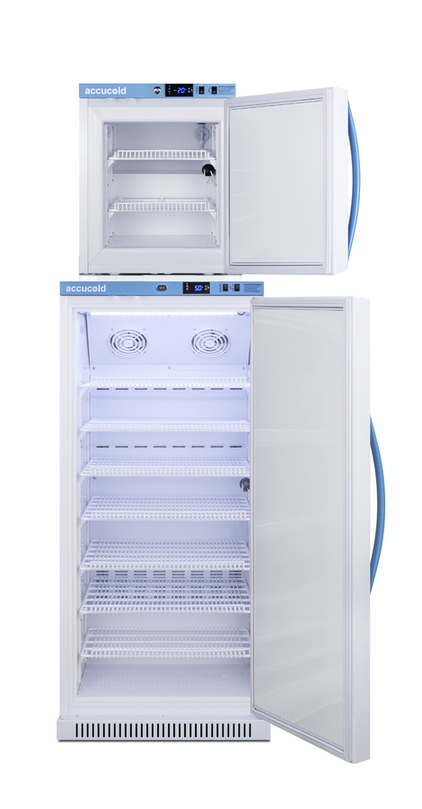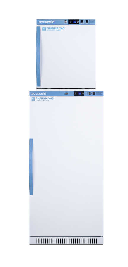 Accucold offers innovative solutions to vaccine storage with our Performance Series stackable purpose-built refrigerator-freezer combinations designed to support meeting CDC/VFC/VFA guidelines. Sized just under 20" wide, the ARS8PV-AFZ1PVSTACK combines the 8 cu.ft. ARS8PV auto defrost all-refrigerator with the 1.4 cu.ft. AFZ1PV all-freezer into one slim footprint using Accucold's StackRack. This ships in three boxes and requires some minor assembly upon delivery. The Pharma-Vac Performance Series is designed to meet the demanding needs of vaccine storage. Both units utilize a microprocessor temperature controller (refrigerator range: +2 to +8ºC; freezer range: -30 to -10ºC). The buffered temperature probe is encased in a glycol-filled bottle to better simulate temperature of the stored product, with an additional sensor that reads air temperature to ensure superior temperature control. The current and min/max temperature display is viewable in Celsius or Fahrenheit to the nearest tenth of a degree. The audible and visual temperature alarms sound if the units' interiors go out of range. Additional alarms include a power failure alert, door open alarm, and sensor failure alarm. Both units are equipped with remote alarm contacts in the rear and a 1/2" probe port on the right side to accept additional monitoring devices. The factory-installed antimicrobial handles are powder-coated with naturally occurring silver ions, which help to reduce the spread of germs, allowing for a safer, cleaner user experience. A hospital grade cord with 'green dot' plug is also included for added safety in high traffic areas. Inside, the ARS8PV refrigerator utilizes adjustable cycle defrost operation to avoid temperature spikes. Optimized forced air cooling with an internal fan ensures excellent temperature stability and uniformity with rapid recovery after door openings. The adjustable plastic-coated wire shelves can be positioned at 1/2" increments to accommodate virtually any sized item. This unit includes LED internal lighting with an on/off rocker switch. The interior is constructed from white powder coated metal to ensure added durability and better temperature retention. Freezer model AFZ1PV can be installed on top of the refrigerator with our stacking rack. This freezer utilizes static manual defrost operation. It comes with two adjustable shelves. Both units include front-mounted keyed locks and powerful magnetic gaskets to ensure a positive seal, with self-closing doors for added protection in high traffic settings. Additional stacked combinations are available. Browse Accucold's website for more information, or contact our sales team at 718-893-3900 to discuss your equipment needs. NOTE: Accucold refrigerators are purpose-built to the support meeting the current CDC (Centers for Disease Control) guidelines for the storage of vaccines. As referenced in the current Vaccine Storage and Handling Toolkit, these units incorporate microprocessor controls and forced air circulation for stable operation between 2 and 8ºC. For additional temperature assurance, the CDC recommends a calibrated digital data logger (DDL), which can be added with the factory-installed option DL2B or addition of the DL2BKit accessory.