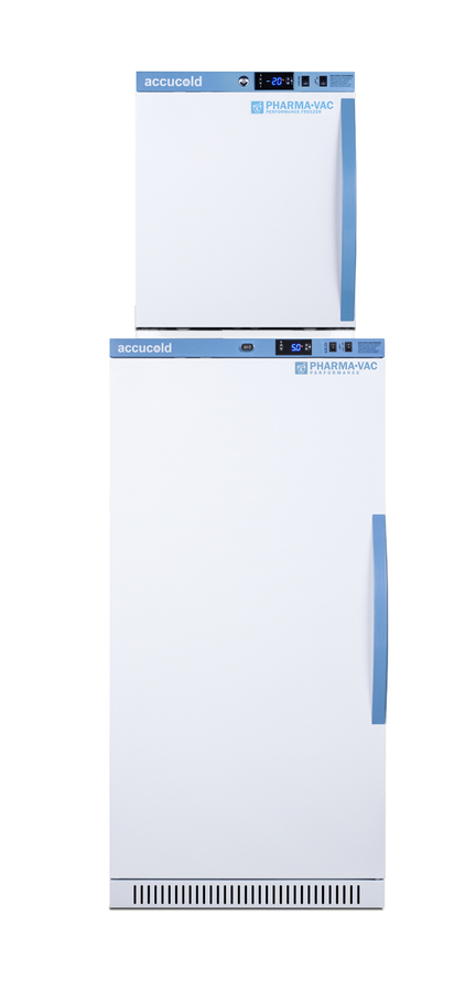 Accucold offers innovative solutions to vaccine storage with our Performance Series stackable purpose-built refrigerator-freezer combinations designed to support meeting CDC/VFC/VFA guidelines. Sized just under 20" wide, the ARS8PV-AFZ1PVSTACKLHD combines the 8 cu.ft. ARS8PV auto defrost all-refrigerator with the 1.4 cu.ft. AFZ1PV all-freezer into one slim footprint using Accucold's StackRack. This ships in three boxes and requires some minor assembly upon delivery. The Pharma-Vac Performance Series is designed to meet the demanding needs of vaccine storage. Both units utilize a microprocessor temperature controller (refrigerator range: +2 to +8ºC; freezer range: -30 to -10ºC). The buffered temperature probe is encased in a glycol-filled bottle to better simulate temperature of the stored product, with an additional sensor that reads air temperature to ensure superior temperature control. The current and min/max temperature display is viewable in Celsius or Fahrenheit to the nearest tenth of a degree. The audible and visual temperature alarms sound if the units' interiors go out of range. Additional alarms include a power failure alert, door open alarm, and sensor failure alarm. Both units are equipped with remote alarm contacts in the rear and a 1/2" probe port on the right side to accept additional monitoring devices. The factory-installed antimicrobial handles are powder-coated with naturally occurring silver ions, which help to reduce the spread of germs, allowing for a safer, cleaner user experience. A hospital grade cord with 'green dot' plug is also included for added safety in high traffic areas. Inside, the ARS8PV refrigerator utilizes adjustable cycle defrost operation to avoid temperature spikes. Optimized forced air cooling with an internal fan ensures excellent temperature stability and uniformity with rapid recovery after door openings. The adjustable plastic-coated wire shelves can be positioned at 1/2" increments to accommodate virtually any sized item. This unit includes LED internal lighting with an on/off rocker switch. The interior is constructed from white powder coated metal to ensure added durability and better temperature retention. Freezer model AFZ1PV can be installed on top of the refrigerator with our stacking rack. This freezer utilizes static manual defrost operation. It comes with two adjustable shelves. Both units include front-mounted keyed locks and powerful magnetic gaskets to ensure a positive seal, with self-closing doors for added protection in high traffic settings. Additional stacked combinations are available. Browse Accucold's website for more information, or contact our sales team at 718-893-3900 to discuss your equipment needs. NOTE: Accucold refrigerators are purpose-built to the support meeting the current CDC (Centers for Disease Control) guidelines for the storage of vaccines. As referenced in the current Vaccine Storage and Handling Toolkit, these units incorporate microprocessor controls and forced air circulation for stable operation between 2 and 8ºC. For additional temperature assurance, the CDC recommends a calibrated digital data logger (DDL), which can be added with the factory-installed option DL2B or addition of the DL2BKit accessory.
