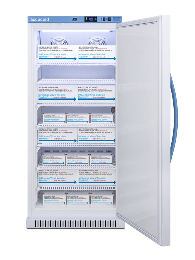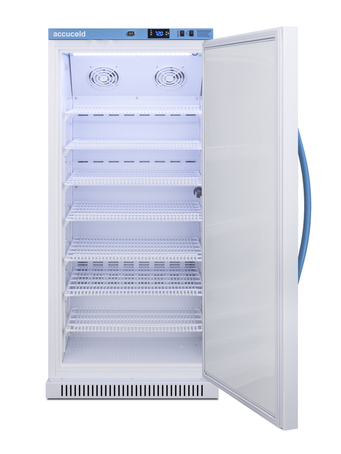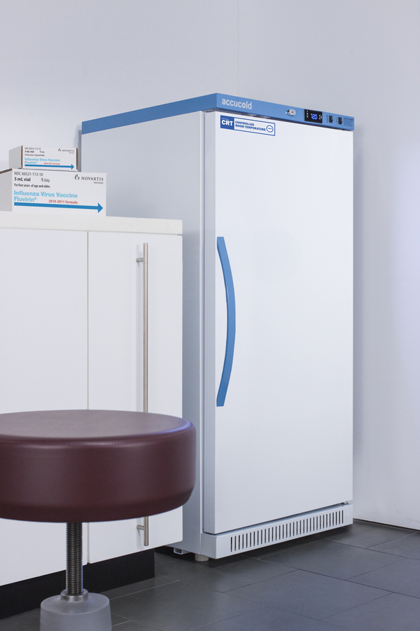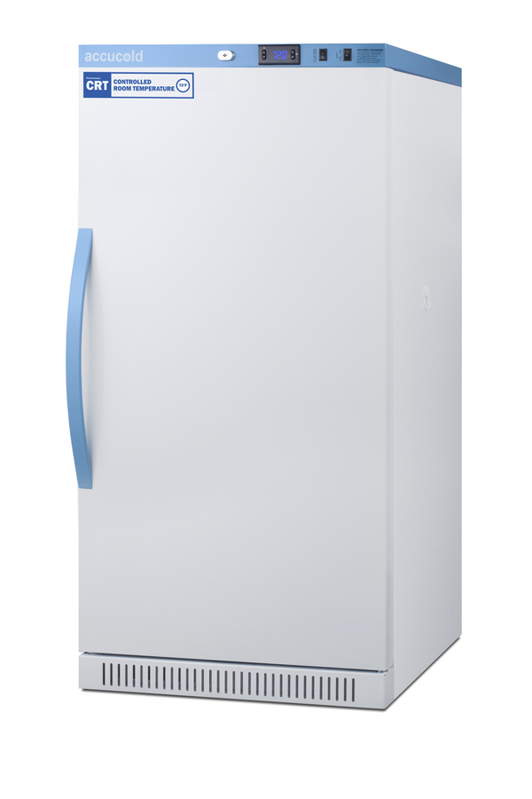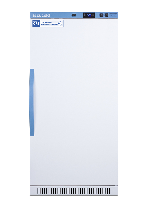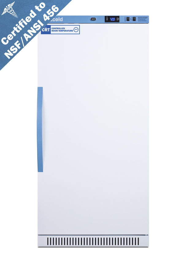 Accucold's Performance Series Controlled Room Temperature Cabinets offer purpose-built storage solutions for medication requiring a stable room temperature environment. The ARS8PV-CRT is an 8 cu.ft. upright unit pre-set to 72ºF, with an adjustable range from 68º to 77ºF. The microprocessor temperature controller is externally located to minimize door openings, helping to protect stored contents from ambient temperature. The buffered temperature probe is encased in a glycol-filled bottle to better simulate temperature of the stored product, with an additional sensor that reads air temperature to ensure superior temperature control. The current and min/max temperature display is viewable in Celsius or Fahrenheit to the nearest tenth of a degree. The audible and visual temperature alarm sounds if the unit's interior goes out of range. Additional alarms include a power failure alert, door open alarm, and sensor failure alarm. This unit is equipped with remote alarm contacts in the rear and a 1/2" probe port on the right side to accept additional monitoring devices. A hospital grade cord with 'green dot' plug is also included for added safety in high traffic areas. Inside, the ARS8PV-CRT utilizes adjustable cycle defrost operation to avoid temperature spikes. Optimized forced air cooling with two internal fans ensures excellent temperature stability and uniformity with rapid recovery after door openings. The adjustable plastic-coated wire shelves can be positioned at 1/2" increments to accommodate virtually any sized item. We include seven shelves, more than competitor products providing to maximize interior shelving storage area. This unit includes LED internal lighting with an on/off rocker switch. The interior is constructed from white powder coated metal to ensure added durability and better temperature retention. The ARS8PV-CRT comes in a white cabinet finish with a blue accented control panel. The factory-installed antimicrobial handle is powder-coated with naturally occurring silver ions, which help to reduce the spread of germs, allowing for a safer, cleaner user experience. The user-reversible door ships with a right hand swing and self-closing function. This model includes a factory-installed lock and ships with two keys for staff use. Powerful magnetic gaskets ensure a positive seal. Designed with hydrocarbon refrigerant, the ARS8PV-CRT provides an energy efficient solution to stabilized room temperature storage, even when ambient temperatures can reach temperatures as cold as 68ºF or warm as 86ºF. This unit is Pyxis, Omnicell, and AcuDose RX compatible. Additional sizes, as well as glass door options, are also available.