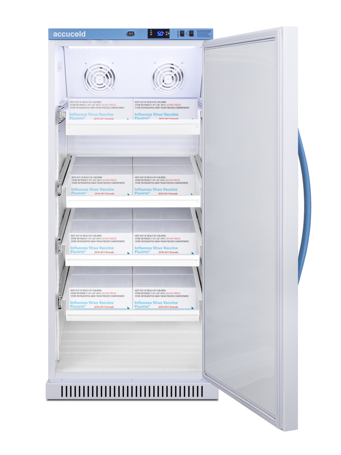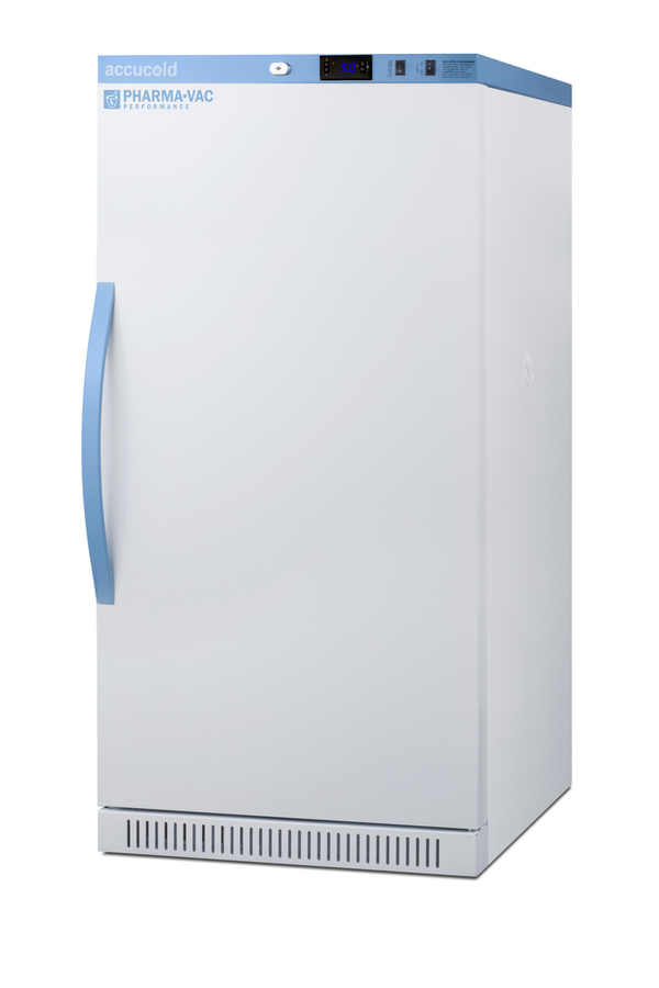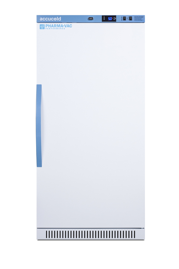 Accucold's Pharma-Vac Performance Series are upright all-refrigerators designed and purpose-built for pharmacy, medication, and vaccine applications to support meeting CDC/VFC/VFA guidelines, with a powder-coated silver ion handle that helps prevent germ spread. The ARS8PVDR is an 8 cu.ft. all-refrigerator with an adjustable control range from +2 to +8ºC. The microprocessor temperature controller is externally located to minimize door openings, helping to protect stored contents from ambient temperature. The buffered temperature probe is encased in a glycol-filled bottle to better simulate temperature of the stored product, with an additional sensor that reads air temperature to ensure superior temperature control. The current and min/max temperature display is viewable in Celsius or Fahrenheit to the nearest tenth of a degree. The audible and visual temperature alarm sounds if the unit's interior goes out of range. Additional alarms include a power failure alert, door open alarm, and sensor failure alarm. This unit is equipped with remote alarm contacts in the rear and a 1/2" probe port on the right side to accept additional monitoring devices. This unit comes with a hospital grade cord with a green dot plug for added safety in high traffic areas. Inside, the ARS8PVDR utilizes adjustable cycle defrost operation to avoid temperature spikes. Optimized forced air cooling with two internal fans ensures excellent temperature stability and uniformity with rapid recovery after door openings. Four white powder-coated aluminum drawers provide ample storage and easy organization. Positioned on ball-bearing glides, the drawers offer full-extension for complete product access. Additionally, each drawer is removable allowing for transport of contents as needed. The drawers also lock into place for added security, while the perforated bottom ensures proper ventilation throughout the unit. LED internal lighting with an on/off rocker switch attractively illuminates the interior for easy viewing. The interior is constructed from white powder-coated metal to ensure added durability and better temperature retention. The ARS8PVDR comes in a white cabinet finish with a blue accented control panel. The factory-installed antimicrobial handle is powder-coated with naturally occurring silver ions, which help to reduce the spread of germs, allowing for a safer, cleaner user experience. The user-reversible door ships with a right-hand swing and self-closing function. This model includes a factory-installed lock and ships with two keys for staff use. Powerful magnetic gaskets ensure a positive seal. Designed with hydrocarbon refrigerant, the ARG8PVDR provides an energy-efficient solution to vaccine storage. This unit is Pyxis, Omnicell, and AcuDose RX compatible. Additional sizes, door options, and units with a combination of standard shelving and drawers are also available. Explore the full Pharma-Vac series at accucold.com/pharmavac. NOTE: Accucold refrigerators are purpose-built to the support meeting the current CDC (Centers for Disease Control) guidelines for the storage of vaccines. Units that end in suffix "456" have been certified to the new NSF 456 standard. As referenced in the current Vaccine Storage and Handling Toolkit, these units incorporate microprocessor controls and forced air circulation for stable operation between 2 and 8ºC. For additional temperature assurance, the CDC recommends a calibrated digital data logger (DDL), which can be added with the factory-installed option DL2B or addition of the DL2BKit accessory.