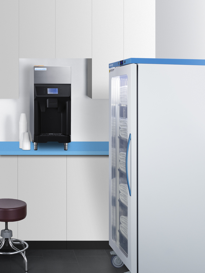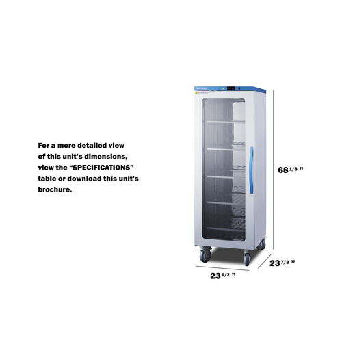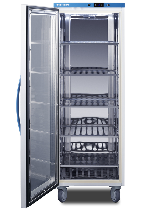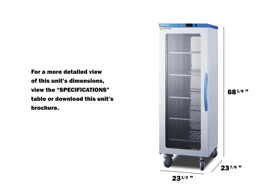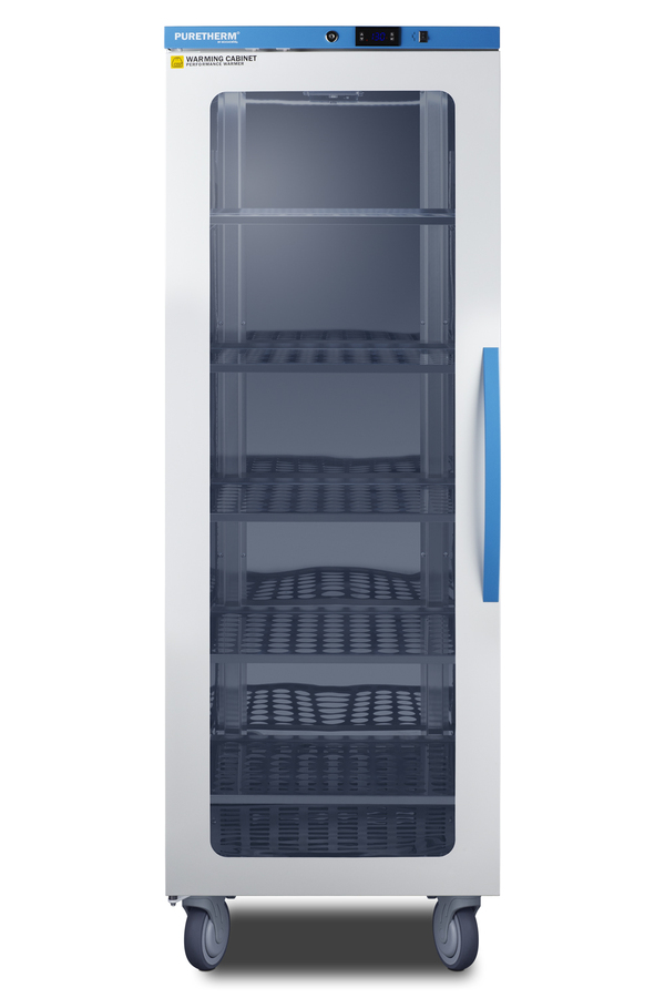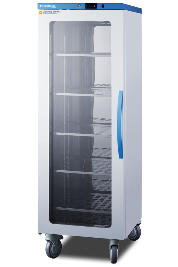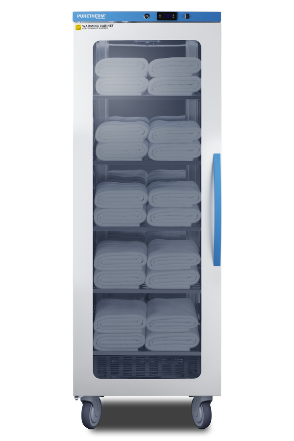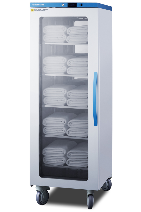 PureTherm by Accucold features Performance Series blanket warmers designed to ensure proper warming temperature for hospitals, emergency centers, physical therapy offices, and other patient facilities. Model AWC12PBLHD is a single chamber blanket warmer ideal for hospital settings keeping blankets at the proper temperature. The double pane tempered self-closing glass door ensures your staff can quickly check inventory with a display that goes down to the floor. This unit is mounted on 7" high rubberized casters with two locking breaks, allowing easy mobility. This unit comes in a white cabinet finish with a blue accented control panel. The factory-installed antimicrobial handle is powder-coated with naturally occurring silver ions, which help to reduce the spread of germs, allowing for a safer, cleaner user experience. This model includes a factory-installed lock conveniently located towards the top of the door for easy staff access. We include a set of two keys. Powerful magnetic gaskets ensure a positive seal. Preset to run at the standard 130ºF blanket temperature, the microprocessor temperature controller is externally located to minimize door openings, helping to reduce energy waste in busy facilities. The temperature range is 90 to 130ºF, but the parameters can be adjusted up to 160ºF if needed (contact Accucold's technical support team for instructions). Audible alarms include an open door and high/low temperature warning. This unit is equipped with remote alarm contacts in the rear. A hospital grade cord with 'green dot' plug is also included for added safety in high traffic areas. Inside, the AWC12PBLHD features stainless steel construction and perforated steel shelving. No internal fan helps to reduce lint buildup for safer, more efficient operation. Additionally, without fans or moving parts, there is no noise produced for silent operation. Sized with a 24" footprint, this unit takes up little space but can accommodate over 12 cu.ft of storage. This unit ships with a left hand door swing. With its conveniently slim dimensions and user-friendly features, the AWC12PBLHD is a great way to keep blankets properly cared for in hospitals, medical and physical therapy offices, wellness centers, spas, and other facilities. All Performance Series units come with an extended 2-year warranty for parts and labor. Additional sizes are available. Visit www.accucold.com/puretherm to explore our complete selection.