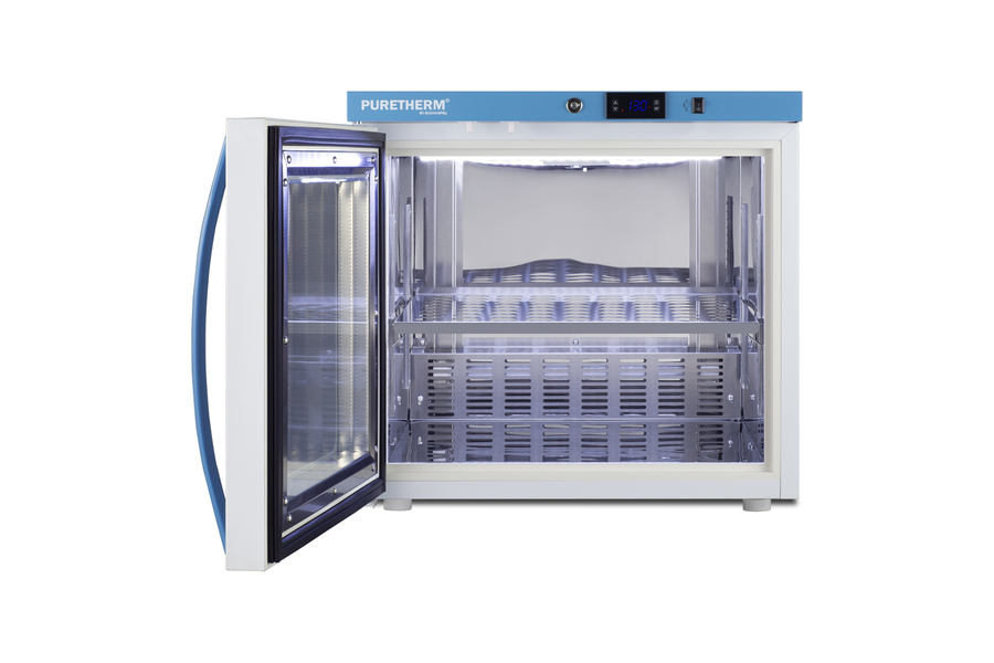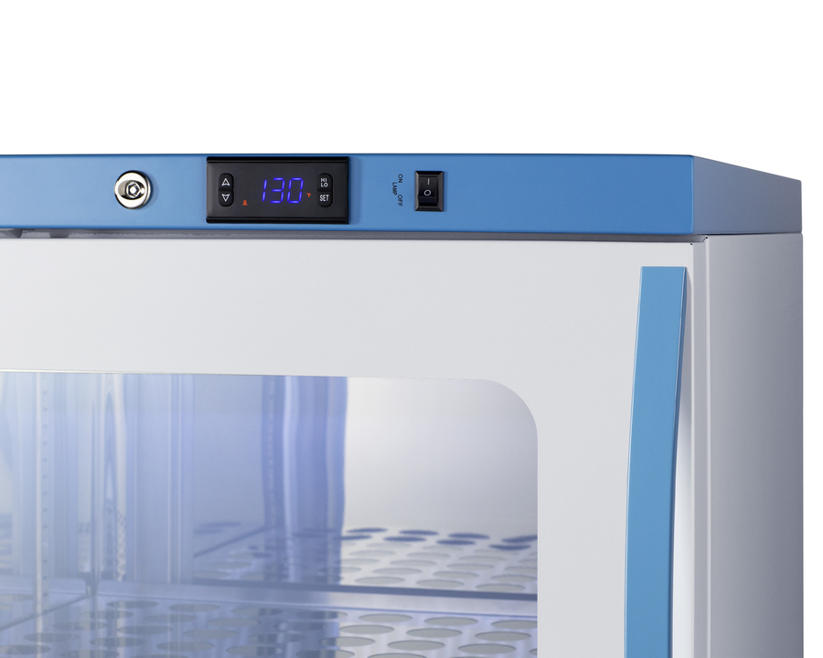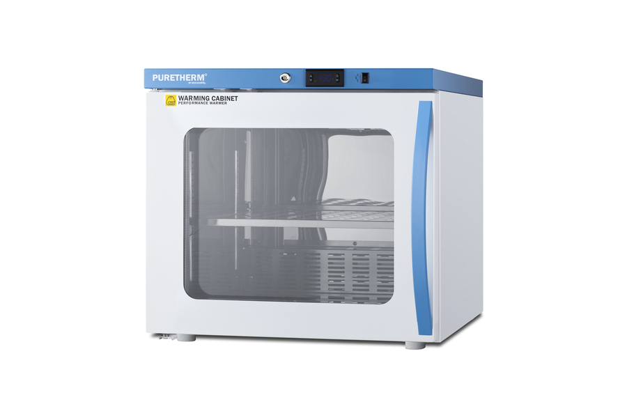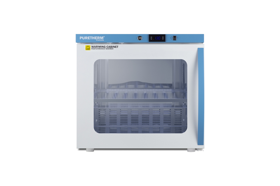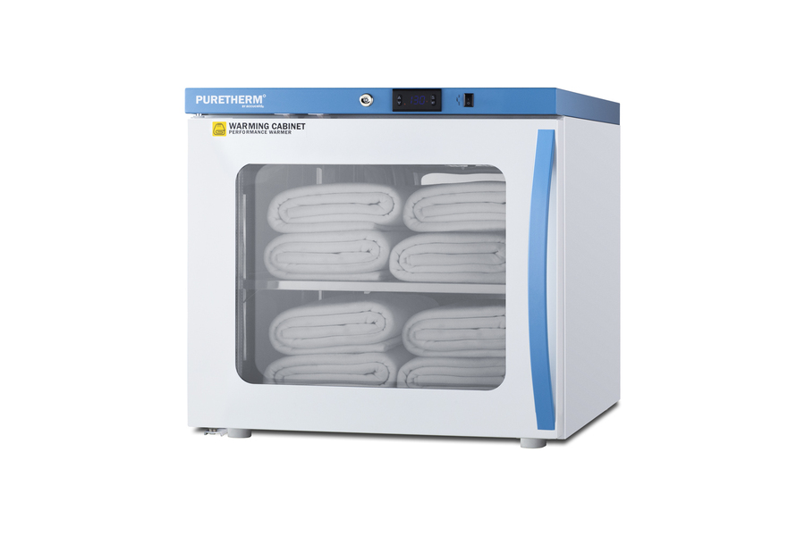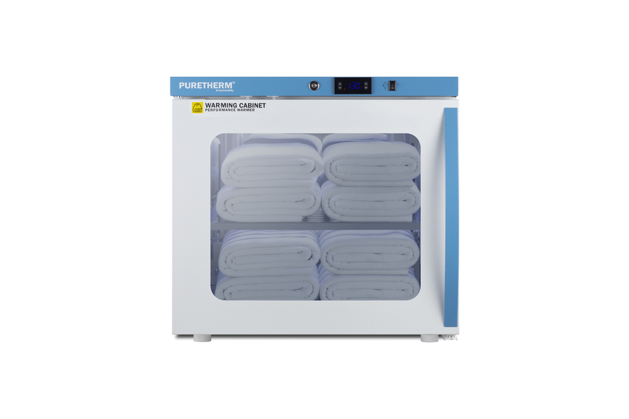 PureTherm by Accucold features Performance Series blanket warmers designed to ensure proper warming temperature for hospitals, emergency centers, physical therapy offices, and other patient facilities. Model AWC2PBLHD is a single chamber blanket warmer ideal for hospital settings keeping blankets at the proper temperature. The double pane tempered self-closing glass door ensures your staff can quickly check inventory with a display that goes down to the floor. This unit comes in a white cabinet finish with a blue accented control panel. The factory-installed antimicrobial handle is powder-coated with naturally occurring silver ions, which help to reduce the spread of germs, allowing for a safer, cleaner user experience. This model includes a factory-installed lock conveniently located towards the top of the door for easy staff access. We include a set of two keys. Powerful magnetic gaskets ensure a positive seal. Preset to run at the standard 130ºF blanket temperature, the microprocessor temperature controller is externally located to minimize door openings, helping to reduce energy waste in busy facilities. The temperature range is 90 to 130ºF, but the parameters can be adjusted up to 160ºF if needed (contact Accucold's technical support team for instructions). Audible alarms include an open door and high/low temperature warning. This unit is equipped with remote alarm contacts in the rear. A hospital grade cord with 'green dot' plug is also included for added safety in high traffic areas. Inside, the AWC2PBLHD features 304 grade polished stainless steel construction and adjustable steel shelves with perforations to ensure proper heat distribution. No internal fan helps to reduce lint buildup for safer, more efficient operation. Additionally, without fans or moving parts, there is no noise produced for silent operation. Sized with a 24" footprint, this unit takes up little space but can accommodate up to 3.39 cu.ft of storage. It comes with a left hand door swing. With its conveniently slim dimensions and user-friendly features, the AWC2PBLHD is a great way to keep blankets properly cared for in hospitals, medical and physical therapy offices, wellness centers, spas, and other facilities. All Performance Series units come with an extended 2-year warranty for parts and labor. Additional sizes are available. Visit www.accucold.com/puretherm to explore our complete selection.