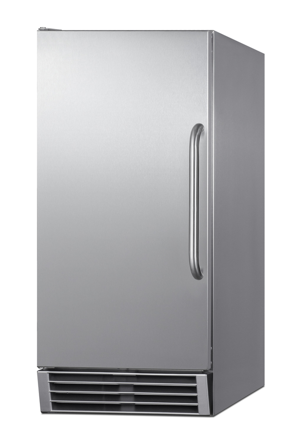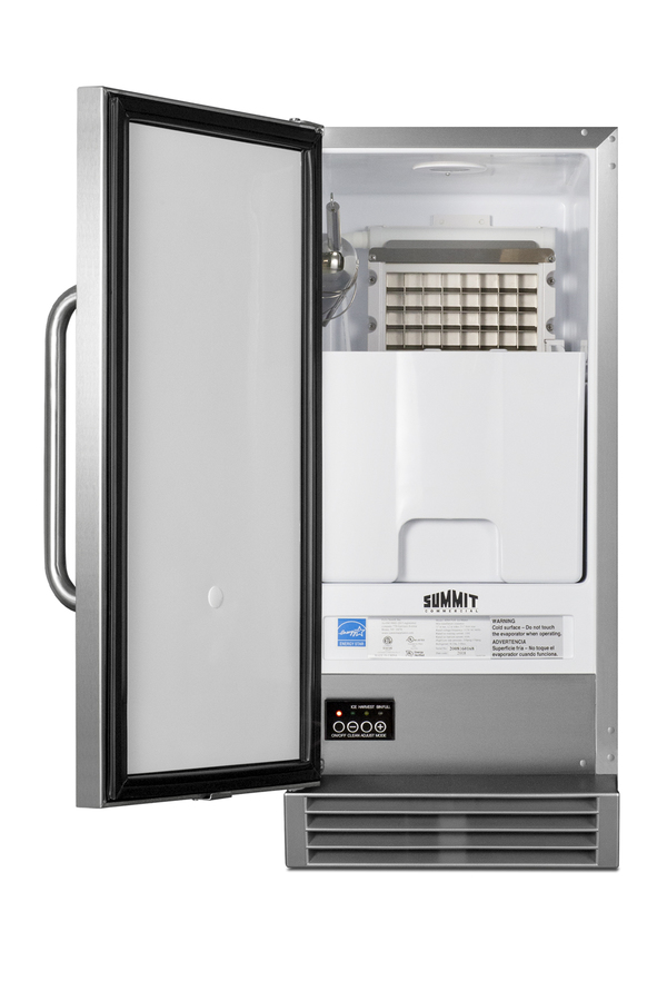 Summit's commercially approved icemakers are an attractive and durable solution to keeping a continuous supply of clear ice on hand in virtually any kitchen space. ENERGY STAR certified for commercial use, BIM44GCSS features a complete stainless steel exterior for added durability and long-term use. The front-breathing design allows built-in use under counters, while the fully finished stainless steel cabinet also allows freestanding use, with a sealed back for easier cleanup. The user-reversible stainless steel door includes a curved towel bar handle for a professional look. NOTE: this unit ships with a left hand door swing that can be reversed before delivery (add suffix RHD) or at home. Inside, the BIM44GCSS has a touch control panel for easy operation. Indicator lights alert users to each step in the production process, as well as to when the bin is full. This unit can produce up to 50 lbs. of clear cube-shaped ice, with an adjustable bin capacity that can hold up to 25 lbs. The ice is produced in sheets and can easily be broken into cubes with the provided stainless steel scoop, which can be mounted on brackets inside for easy use. An interior light in a blue hue allows for easy viewing of the interior, while automatic defrost operation makes maintenance simple and stress-free. This model comes equipped with an internal pump, while four adjustable leveling legs keep the unit level on uneven surfaces. Sized at 15" wide, BIM44GCSS is ETL-S listed to NSF-12 for use in foodservice settings and can also be installed in any kitchen or wet bar. An ADA compliant version (see BIM44GCSSADA) and a panel-ready version (see BIM44GCSSIF) are also available.