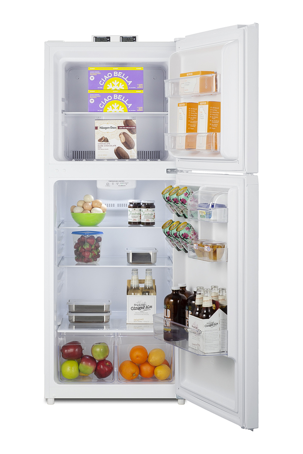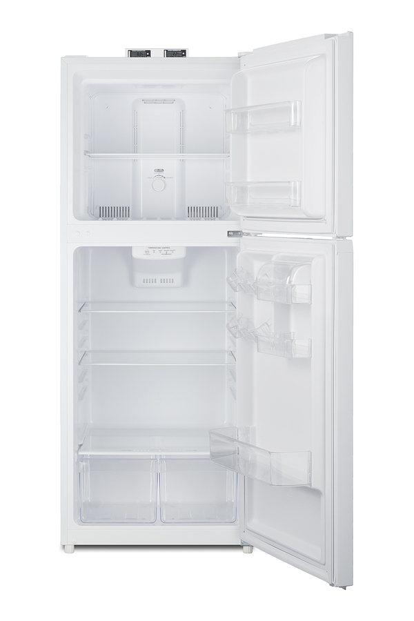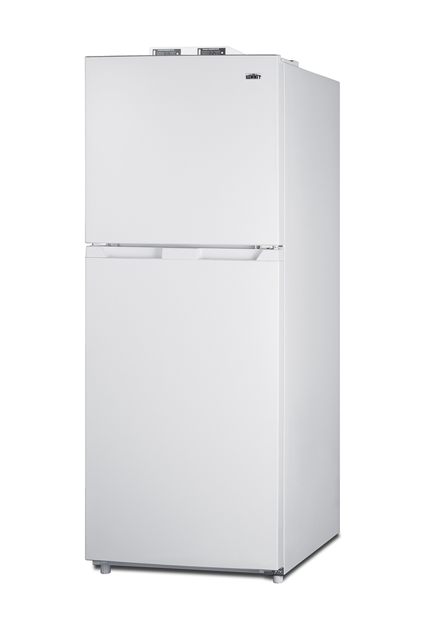 Summit's selection of break room refrigeration features a variety of units for convenient and reliable storage in hospitals, clinics, and other facilities. The BKRF1088W is a full-sized refrigerator-freezer specifically designed for use in break rooms and other common areas. The large interior offers 10.1 cu.ft. of storage capacity. A dial thermostat located inside affords easy temperature management, with two NIST-calibrated thermometers externally mounted on top of the unit to provide a temperature readout of the current and high/low temperatures in each section to the nearest tenth of a degree. Temperature can be viewed in Celsius or Fahrenheit for added convenience. Each thermometer includes an audible high/low alarm function to warn users if the refrigerator or freezer section exceeds the specified temperature range. Inside, the BKRF1088W utilizes frost-free operation for easy user maintenance. Both the refrigerator and freezer compartments include adjustable spill-proof glass shelves and door racks for easy storage. A large crisper drawer helps keep your greens fresh. The refrigerator section includes an automatic interior light for an easy view of stored contents. The BKRF1088W features an all-white interior and exterior for easy cleanability. This unit is available with a left-hand door swing (see the BKRF1088WLHD), as well as with black (see the BKRF1087B) and stainless steel (see the BKRF1089PL) doors. Visit summitappliance.com to view the complete collection.
