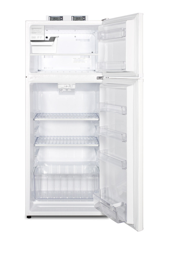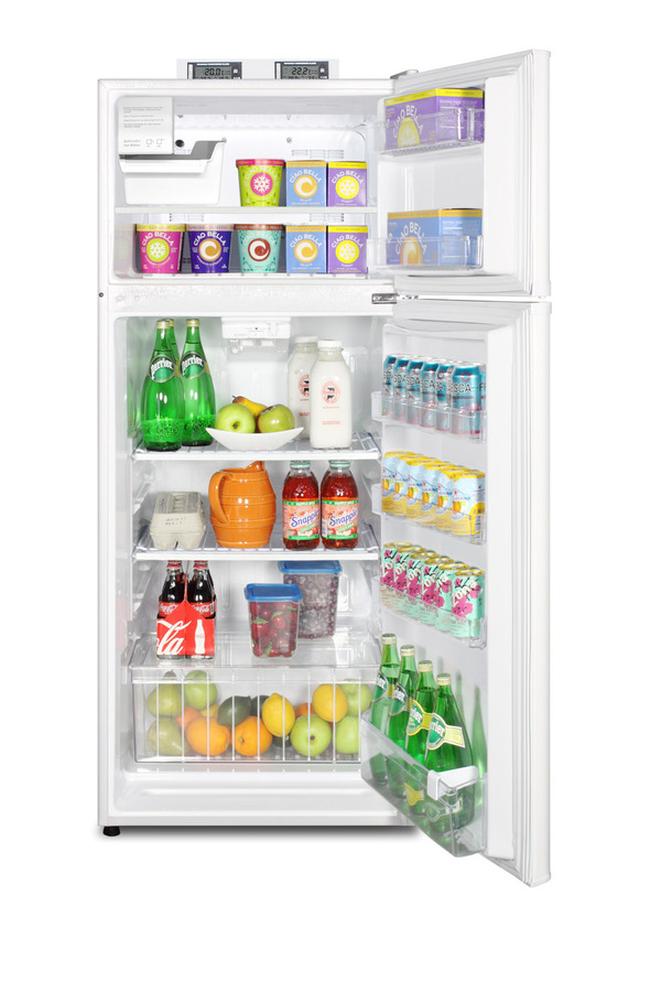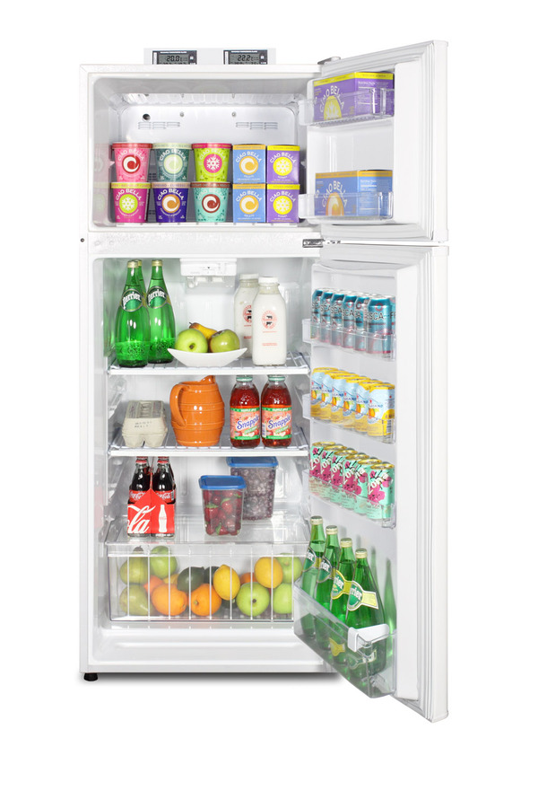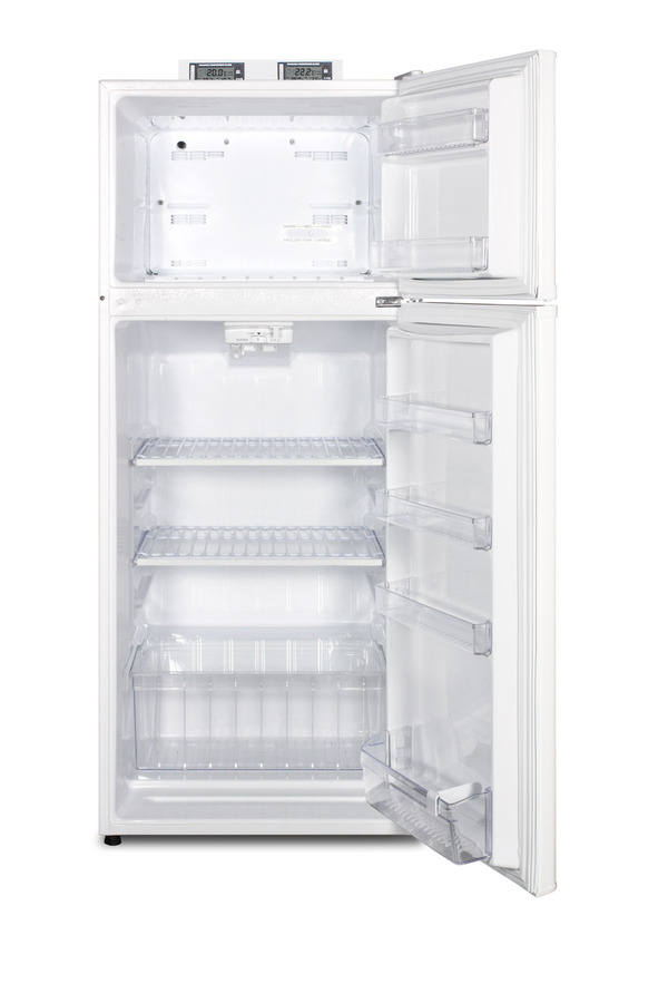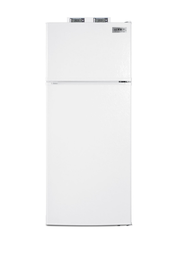 The BKRF1118W is a mid-sized refrigerator-freezer specially designed for use in break rooms and other common areas. Made in North America, this two-door refrigerator-freezer offers over 10 cu.ft. of storage capacity inside a conveniently slim 24" W x 26" D footprint. The temperature is managed by a dial thermostat, with two NIST calibrated thermometers externally mounted on top of the unit to provide a temperature readout of the current and high/low temperatures in each section to the nearest tenth of a degree. Temperature can be viewed in Celsius or Fahrenheit for added convenience. Each thermometer includes an audible high/low alarm function to warn users if the refrigerator or freezer section goes out of the user-specified temperature range. Frost-free operation ensures low maintenance, while the interior is fully equipped with adjustable shelves, a large crisper, interior light, and door storage in both compartments. This unit comes in a textured white cabinet with user-reversible white doors. Additional styles and sizes are available. Note: Model prefix "BKRF" is a marketing designation. Actual unit will carry Summit model number FF1118W.
