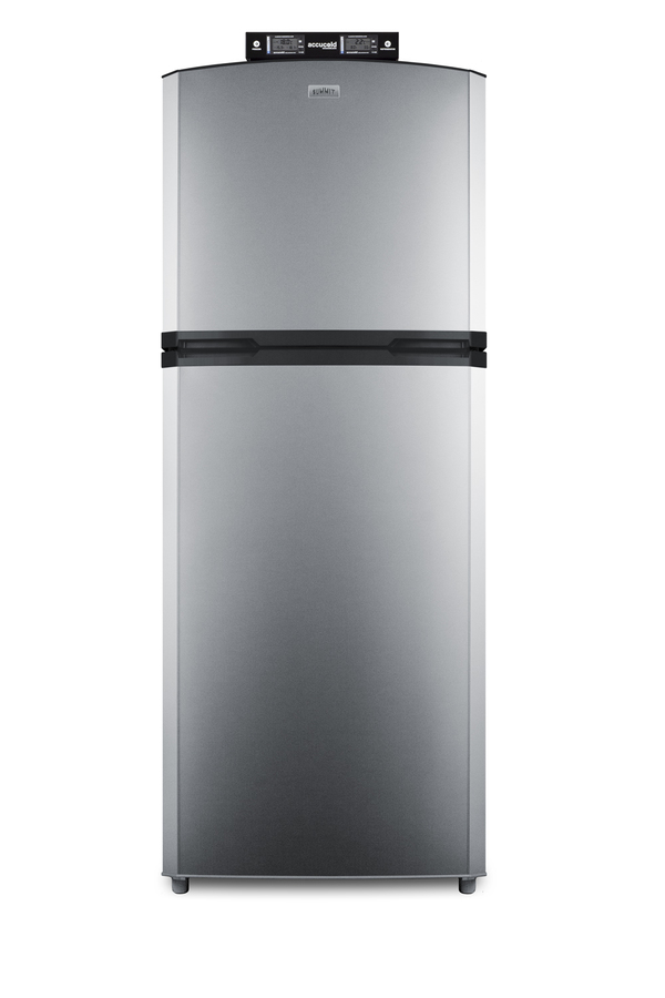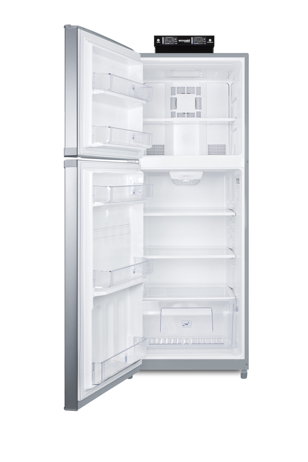 SUMMIT's selection of break room refrigeration features a variety of units for convenient and reliable storage in hospitals, clinics, and other facilities. Made in North America, the BKRF14SSLHD is a full-sized refrigerator-freezer specifically designed for use in break rooms and other common areas. The large interior offers 12.9 cu.ft. of storage capacity. A dial thermostat located inside affords easy temperature management, with two NIST calibrated thermometers externally mounted on top of the unit to provide a temperature readout of the current and high/low temperatures in each section to the nearest tenth of a degree. Temperature can be viewed in Celsius or Fahrenheit for added convenience. Each thermometer includes an audible high/low alarm function to warn users if the refrigerator or freezer section goes out of the specified temperature range. Inside, the BKRF14SSLHD utilizes frost-free operation for easy user maintenance. Both the refrigerator and freezer compartments include adjustable spill-proof glass shelves and door racks for easy storage. A large crisper drawer helps keep your greens fresh. The refrigerator section includes an automatic interior light for an easy view of stored contents. The BKRF14SSLHD features a black exterior cabinet, as well as stainless steel doors and handles. This unit has a left-hand door swing. (Note: The doors are not user-reversible. For a right-hand door swing, see the BKRF14SS.) This unit is also available with white (see the BKRF14WLHD) or black (see the BKRF14BLHD) doors. Visit www.summitappliance.com to view the complete collection.