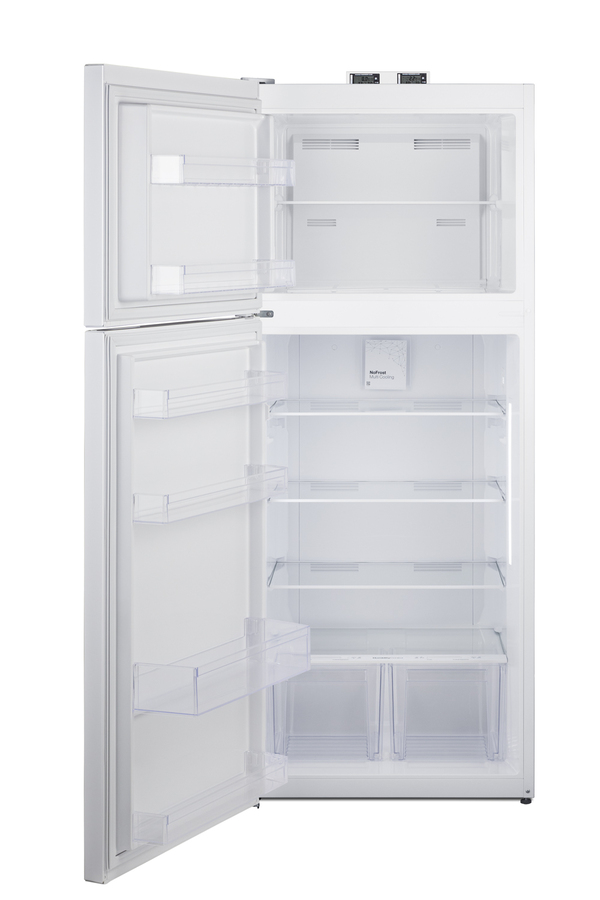Summit's selection of break room refrigeration features a variety of units for convenient and reliable storage in hospitals, clinics, and other facilities. The ENERGY STAR certified BKRF151WLHD is a top-mount refrigerator-freezer that offers a spacious 14.3 cu.ft. of storage capacity in a popular 28" fit. The smooth white doors and cabinet offer a modern look for contemporary spaces, with a sealed back design to ensure easier cleanup. This unit ships with a left hand door swing. Located at the top of the BKRF151WLHD are two NIST-calibrated thermometers to provide a temperature readout of the current and high/low temperatures in each section to the nearest tenth of a degree. Temperature can be viewed in Celsius or Fahrenheit for added convenience. Each thermometer includes an audible high/low alarm function to warn users if the refrigerator or freezer section exceeds the specified temperature range. Inside, the BKRF151WLHD utilizes frost-free defrost to minimize user-maintenance. The freezer compartment includes a removable glass shelf and two fixed door shelves. The SuperFreeze setting is ideal for freezing newly loaded foods quickly. The refrigerator section is fully featured for fresh foods with interior lighting, spill-proof adjustable glass shelves, two humidity-controlled clear crispers, and removable door racks that accommodate gallon-sized containers. With its ENERGY STAR certified performance and convenient features, the European-made BKRF151WLHD is the ideal choice for break rooms and facilities looking for an energy-efficient refrigerator-freezer. For this unit without the NIST-calibrated thermometers, see model CTR151W. Additional colors and sizes are available.