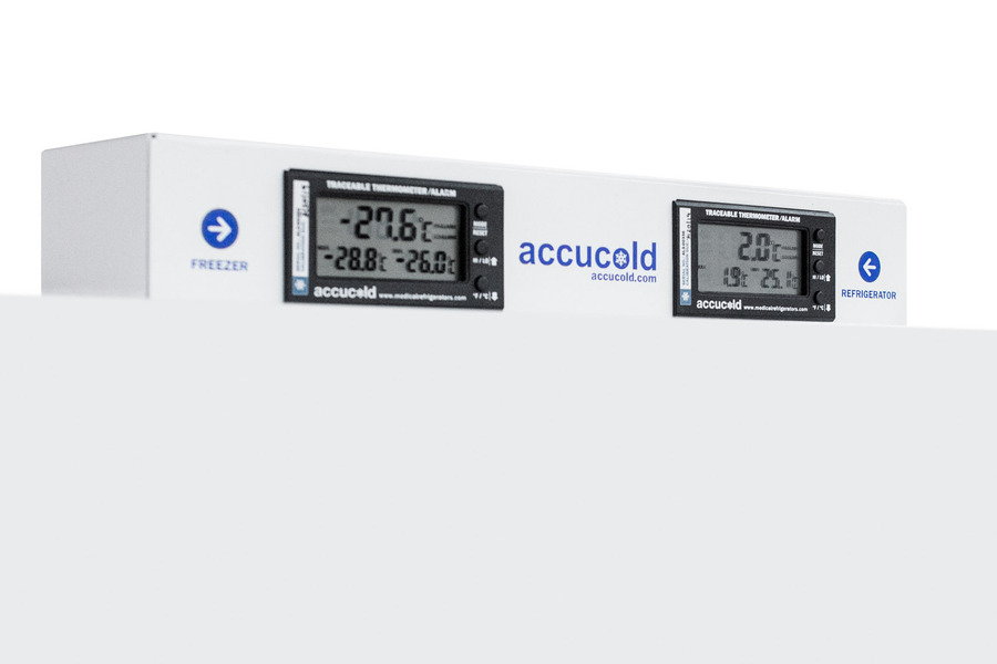 Two thermometers provide an external readout of the current and high/low refrigerator and freezer temperature to the nearest tenth of a degree