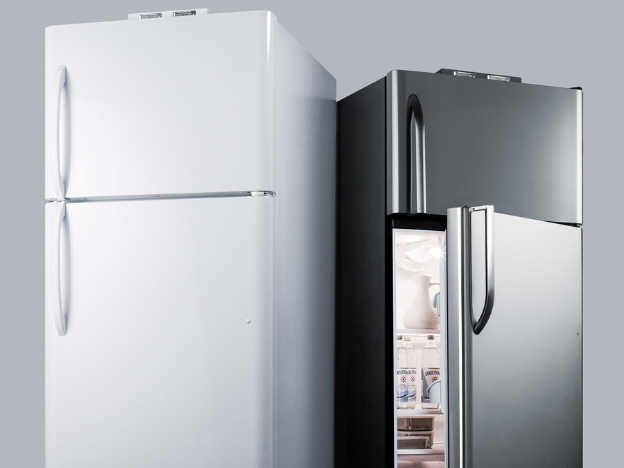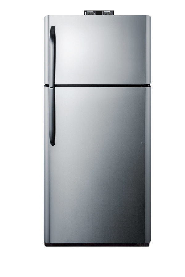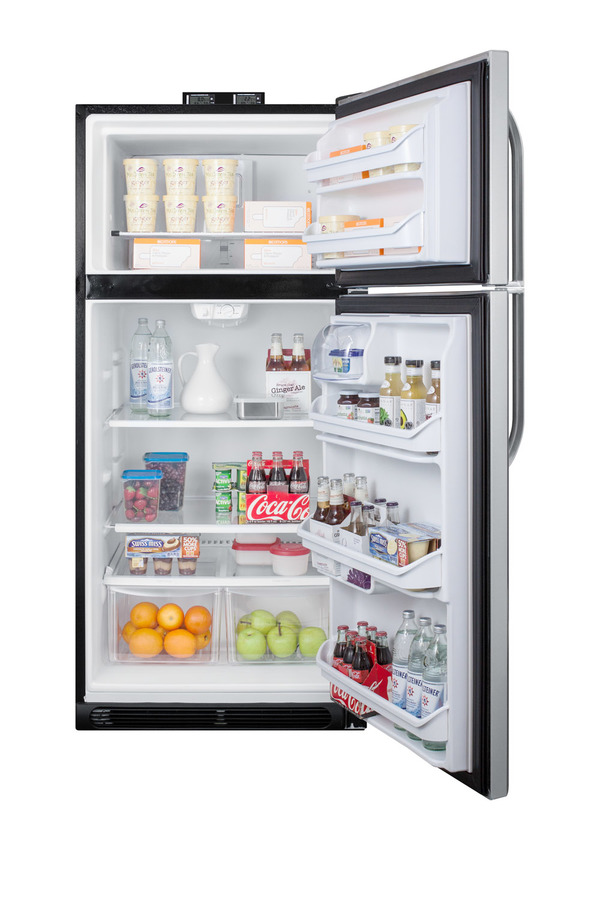 NOTE: Accucold and Summit full-sized CTR/BKRF series refrigerator-freezers are listed on our website with general dimensions that may vary slightly from the actual unit. The BKRF18PL is a full-sized refrigerator-freezer specially designed for use in break rooms and other common areas. The large interior offers 18 cu.ft. of storage capacity, with frost-free operation for low maintenance use. The temperature is managed by a dial thermostat, with two NIST calibrated thermometers externally mounted on top of the unit to provide a temperature readout of the current and high/low temperatures in each section to the nearest tenth of a degree. Temperature can be viewed in Celsius or Fahrenheit for added convenience. Each thermometer includes an audible high/low alarm function to warn users if the refrigerator or freezer section goes out of the specified temperature range. Inside, the BKRF18PL includes adjustable shelves in the refrigerator compartment, as well as crispers. The door features full-sized storage racks. The upper freezer compartment comes with a full-width wire shelf and door bins. The BKRF18PL features a textured gray cabinet and user-reversible fingerprint-free doors with a stainless steel look. This unit is also available in a white finish. NOTE: Actual product may vary from the images displayed on this webpage.