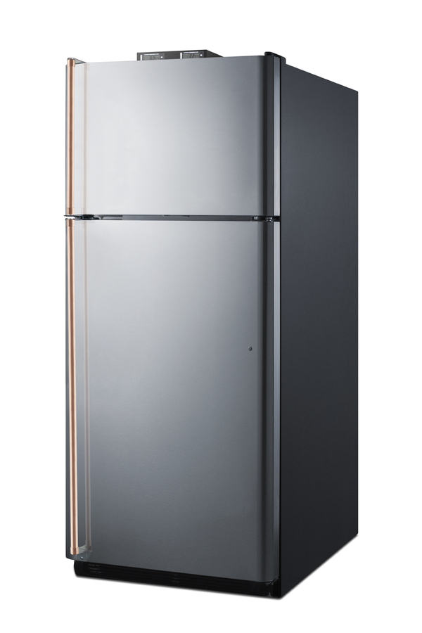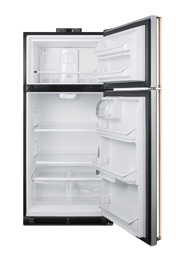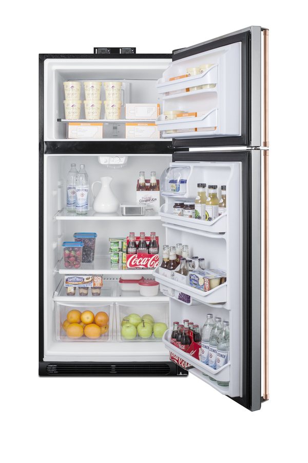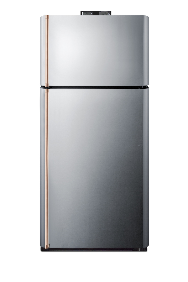 NOTE: Accucold and Summit full-sized CTR/BKRF series refrigerator-freezers are listed on our website with general dimensions that may vary slightly from the actual unit. The BKRF18PLCP is a full-sized refrigerator-freezer specially designed for use in break rooms and other common areas. The large interior offers 18 cu.ft. of storage capacity, with frost-free operation for low maintenance use. The temperature is managed by a dial thermostat, with two NIST calibrated thermometers externally mounted on top of the unit to provide a temperature readout of the current and high/low temperatures in each section to the nearest tenth of a degree. Temperature can be viewed in Celsius or Fahrenheit for added convenience. Each thermometer includes an audible high/low alarm function to warn users if the refrigerator or freezer section goes out of the specified temperature range. Inside, the BKRF18PLCP includes adjustable shelves in the refrigerator compartment, as well as crispers. The door features full-sized storage racks. The upper freezer compartment comes with a full-width wire shelf and door bins. The BKRF18PLCP features a textured gray cabinet and fingerprint-free doors with a stainless steel look. Two full-length factory-installed pipe style handles are made from pure copper. Through its natural antimicrobial properties, copper will kill microbes, including viruses, in a shorter timeframe than most other metal surfaces allowing for a safer, cleaner user experience. This unit is also available in a white finish. NOTE: Actual product may vary from the images displayed on this webpage.