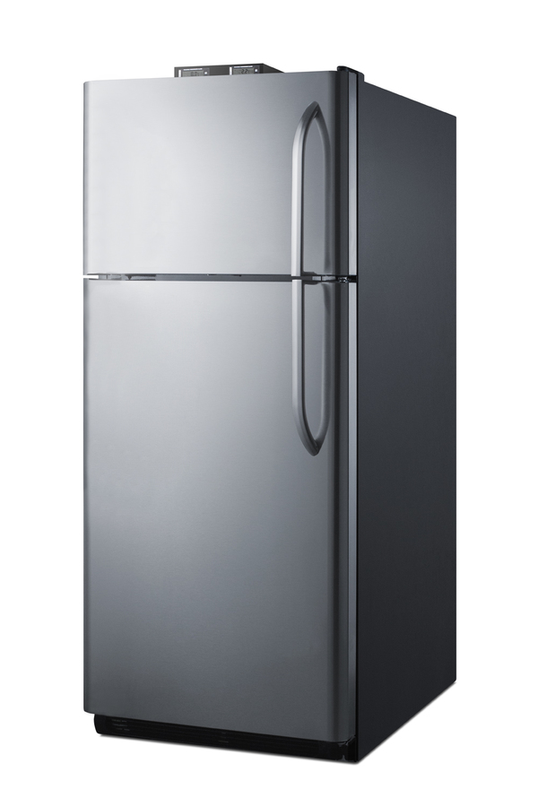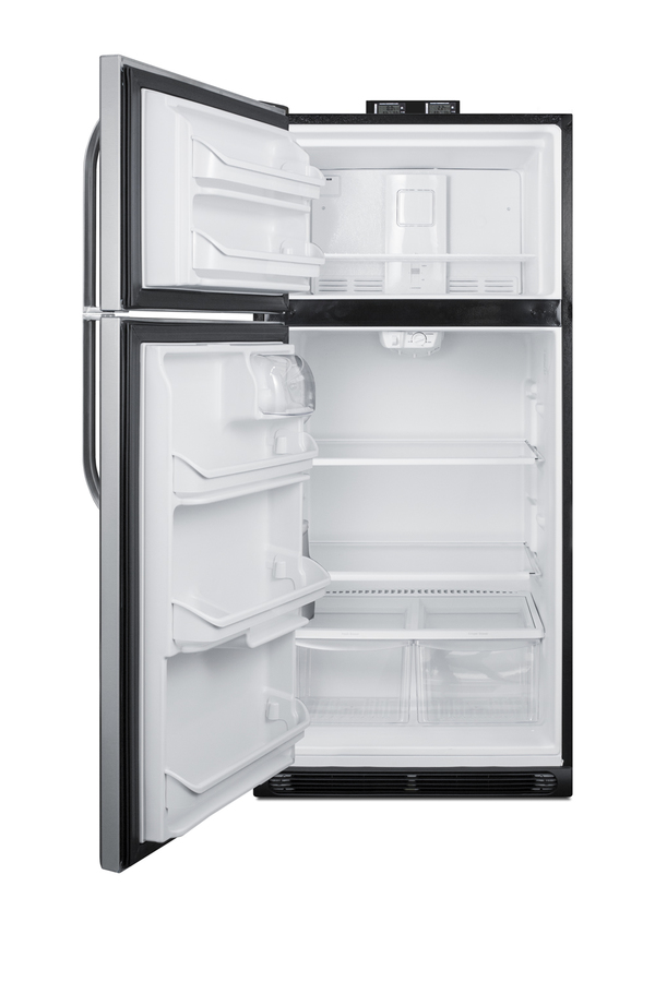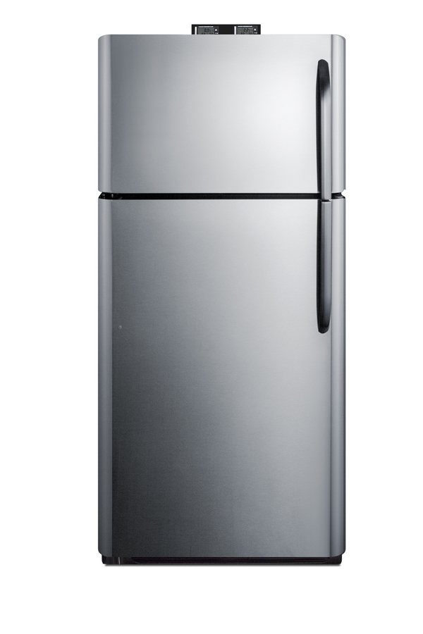 NOTE: Accucold and Summit full-sized CTR/BKRF series refrigerator-freezers are listed on our website with general dimensions that may vary slightly from the actual unit. The BKRF18PLLHD is a full-sized refrigerator-freezer specially designed for use in break rooms and other common areas. The large interior offers 18 cu.ft. of storage capacity, with frost-free operation for low maintenance use. The temperature is managed by a dial thermostat, with two NIST calibrated thermometers externally mounted on top of the unit to provide a temperature readout of the current and high/low temperatures in each section to the nearest tenth of a degree. Temperature can be viewed in Celsius or Fahrenheit for added convenience. Each thermometer includes an audible high/low alarm function to warn users if the refrigerator or freezer section goes out of the specified temperature range. Inside, the BKRF18PLLHD includes adjustable shelves in the refrigerator compartment, as well as crispers. The door features full-sized storage racks. The upper freezer compartment comes with a full-width wire shelf and door bins. The BKRF18PLLHD features a textured gray cabinet fingerprint-free doors with a stainless steel look. It ships with a non-reversible left hand door swing. This unit is also available in a white finish. NOTE: Actual product may vary from the images displayed on this webpage.