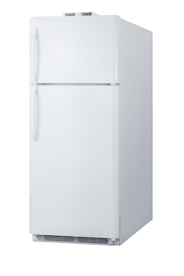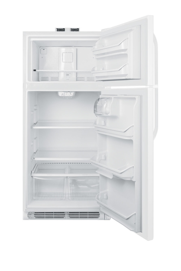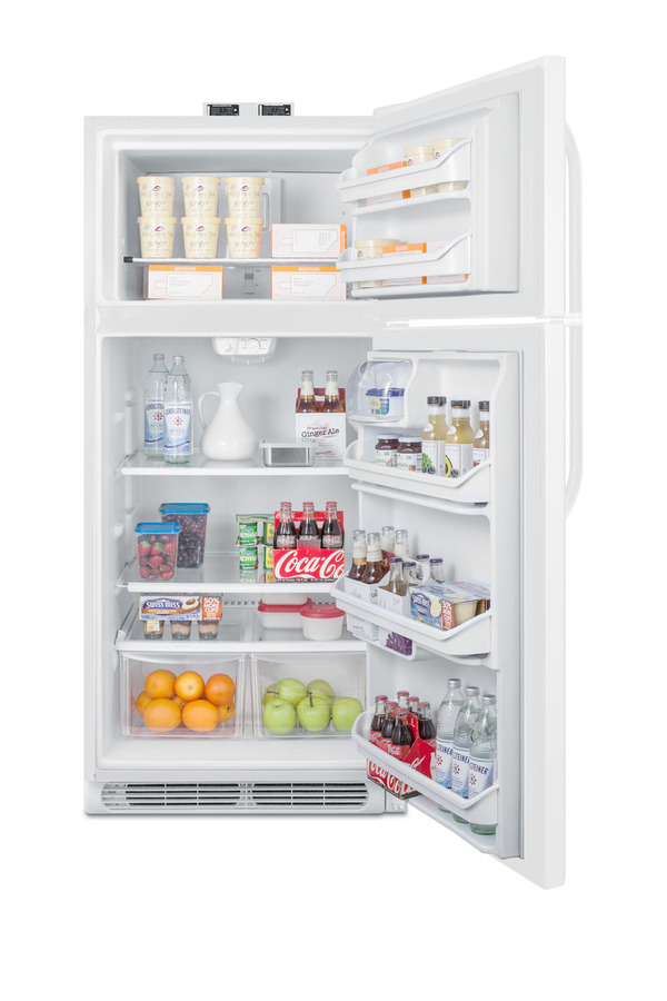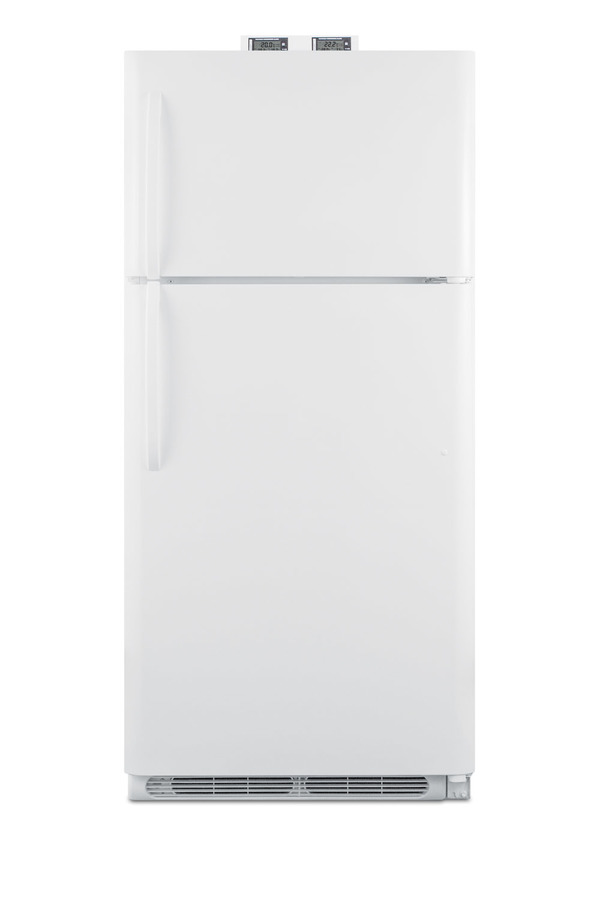 NOTE: Accucold and Summit full-sized CTR/BKRF series refrigerator-freezers are listed on our website with general dimensions that may vary slightly from the actual unit. The BKRF18W is a full-sized refrigerator-freezer specially designed for use in break rooms and other common areas. The large interior offers 18 cu.ft. of storage capacity, with frost-free operation for low maintenance use. The temperature is managed by a dial thermostat, with two NIST calibrated thermometers externally mounted on top of the unit to provide a temperature readout of the current and high/low temperatures in each section to the nearest tenth of a degree. Temperature can be viewed in Celsius or Fahrenheit for added convenience. Each thermometer includes an audible high/low alarm function to warn users if the refrigerator or freezer section goes out of the specified temperature range. Inside, the BKRF18W includes adjustable shelves in the refrigerator compartment and two clear crispers. The door features full-sized storage racks, including two that hold full gallon containers. The upper freezer compartment comes with a full-width wire shelf and two door bins. The BKRF18W features a white finish and user-reversible doors and handles. This unit is also available with a factory installed combination lock and in a stainless steel finish. NOTE: Actual product may vary from the images displayed on this webpage.