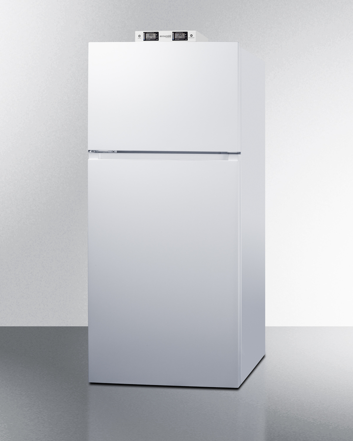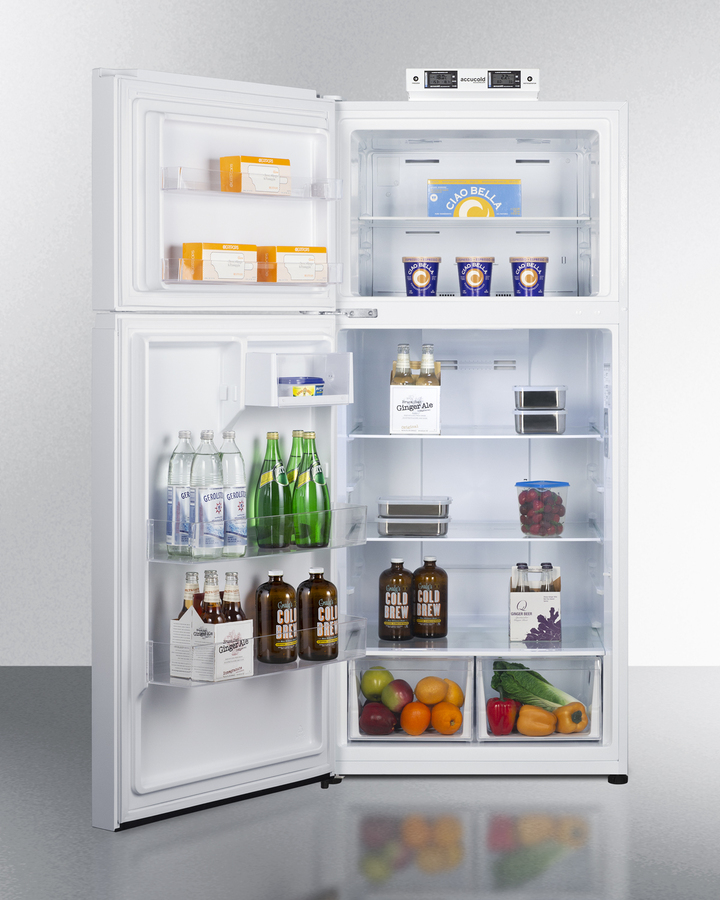 Summit's selection of break room refrigeration features a variety of units for convenient and reliable storage in hospitals, clinics, and other facilities. Made in North America, the BKRF18W2LHD is a 30" wide ENERGY STAR-certified top-mount refrigerator-freezer that offers over 18 cu.ft. of storage capacity. Classic white doors feature pocket handles, with a smooth white cabinet for a timeless look in any kitchen. This unit has a sealed rear and right-angle cord for a better fit. It comes with a left-hand door swing. Located at the top of the BKRF18W2LHD are two NIST-calibrated thermometers that provide a temperature readout of the current and high/low temperatures in each section to the nearest tenth of a degree. Temperature can be viewed in Celsius or Fahrenheit for added convenience. Each thermometer includes an audible high/low alarm function to warn users if the refrigerator or freezer section exceeds the specified temperature range. Inside, the BKRF18W2LHD comes fully featured for convenient storage. The refrigerator section includes adjustable spill-proof glass shelves and two clear crispers. The refrigerator's door includes two full gallon racks and a covered butter rack. The fresh food section features intuitive touch controls and LED lighting. The spacious freezer compartment includes its own dial thermostat for exact temperature control, two door shelves, and an adjustable glass shelf. With its ENERGY STAR certified performance and convenient features, the European-made BKRF18W2LHD is the ideal choice for break rooms and facilities looking for an energy-efficient refrigerator-freezer. Additional colors and sizes are available, as well as optional locks.