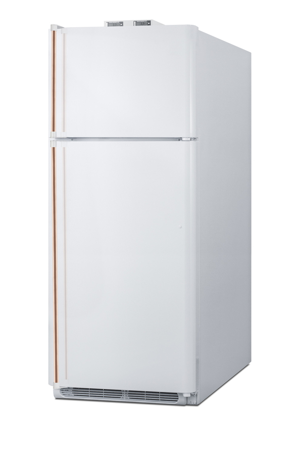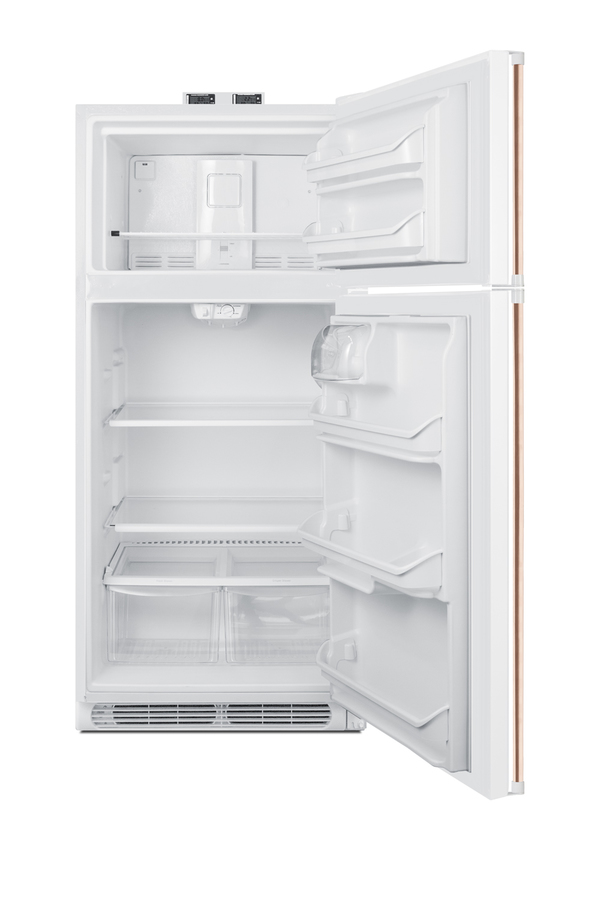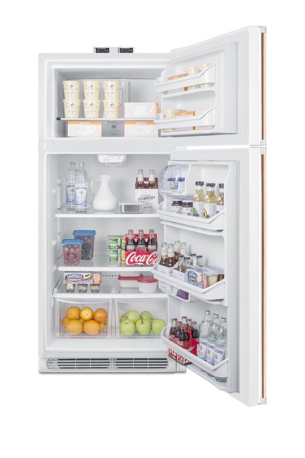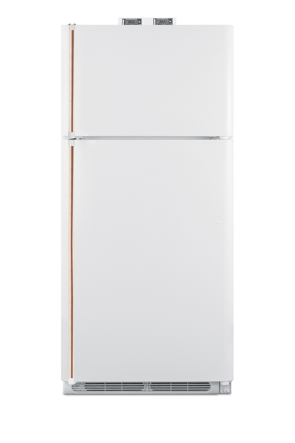NOTE: Accucold and Summit full-sized CTR/BKRF series refrigerator-freezers are listed on our website with general dimensions that may vary slightly from the actual unit. The BKRF18WCP is a full-sized refrigerator-freezer specially designed for use in break rooms and other common areas, with antimicrobial handles for added safety in high traffic areas. The BKRF18WCP features a large interior with 18 cu.ft. of storage capacity and frost-free operation for low maintenance use. The temperature is managed by a dial thermostat, with two NIST calibrated thermometers externally mounted on top of the unit to provide a temperature readout of the current and high/low temperatures in each section to the nearest tenth of a degree. Temperature can be viewed in Celsius or Fahrenheit for added convenience. Each thermometer includes an audible high/low alarm function to warn users if the refrigerator or freezer section goes out of the specified temperature range. This unit includes two full-length factory-installed pipe style handles made from pure copper. Through its natural antimicrobial properties, copper will kill microbes, including viruses, in a shorter timeframe than most other metal surfaces allowing for a safer, cleaner user experience. This unit is also available with a factory installed combination lock and in a stainless steel finish. The door comes with a right hand door swing. For a left hand version, see the BKRF18WCPLHD. Inside, the BKRF18WCP includes adjustable glass shelves in the refrigerator compartment and two clear crispers. The door features full-sized storage racks, including two that hold full gallon containers. The upper freezer compartment comes with a full-width wire shelf and two door bins. NOTE: Actual product may vary from the images displayed on this webpage.