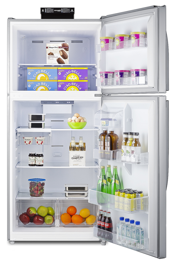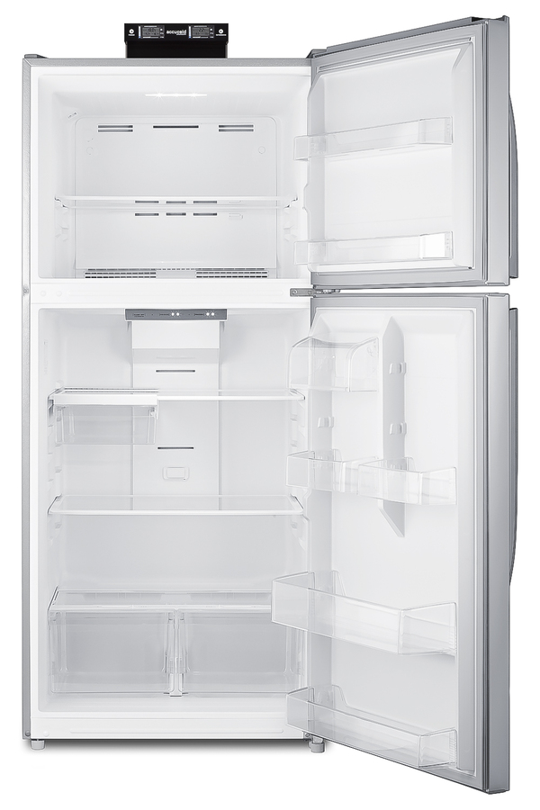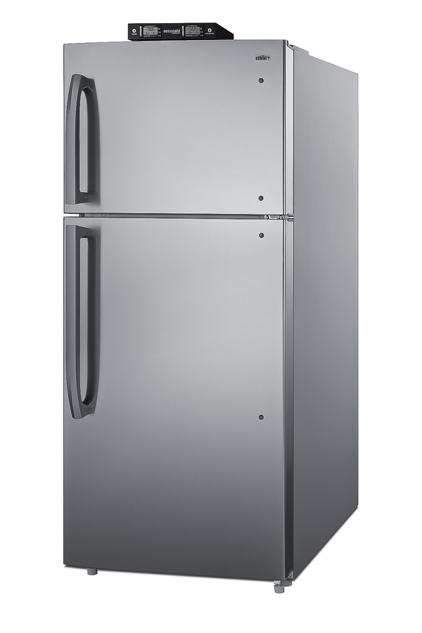 NOTE: Accucold and Summit full-sized CTR/BKRF series refrigerator-freezers are listed on our website with general dimensions that may vary slightly from the actual unit. The BKRF21SS is a full-sized refrigerator-freezer specially designed for use in healthcare breakrooms. The large interior offers nearly 21 cu.ft. of storage capacity, with frost-free operation for low maintenance use. The temperature is managed by a dial thermostat, with two NIST calibrated thermometers externally mounted on top of the unit to provide a temperature readout of the current and high/low temperatures in each section to the nearest tenth of a degree. Temperature can be viewed in Celsius or Fahrenheit for added convenience. Each thermometer includes an audible high/low alarm function to alert staff if perishable items or critical materials are exposed to out of range temperatures. Inside, the BKRF21SS includes adjustable glass shelves in the refrigerator compartment, as well as multiple drawers. The door features full-sized storage racks, including two that hold full gallon containers. The upper freezer compartment comes with a full-width wire shelf and two door bins. The BKRF21SS features a textured black finish and user-reversible stainless steel doors. This unit is also available with a factory installed combination lock. Designed to comply with JCAHO recommendations, it is not intended for residential use. NOTE: This product is not manufactured by Accucold or one of its partners. It is one of a small number of refrigerator-freezers distributed by us for the convenience of customers in some market areas. The product you receive will have the manufacturer's name and model number. It will carry the same new product warranty as a Summit or Accucold appliance and will match the specifications on the website. For exact product details, please call your FSI sales representative. This model is not available in all markets and is manufactured in North America.