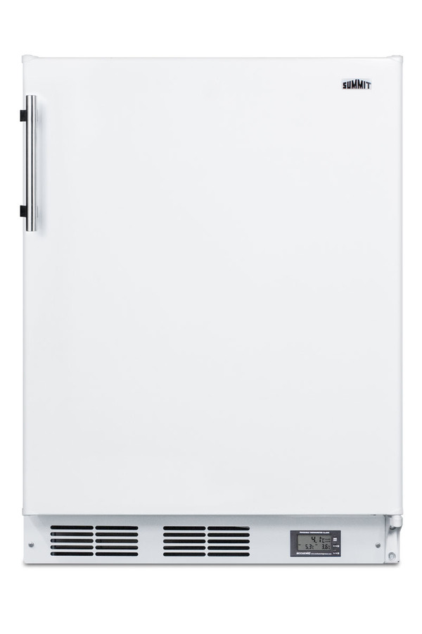 SUMMIT's selection of break room refrigeration features a variety of units for convenient and reliable storage in hospitals, clinics, and other facilities. The BKRF661 is a counter height refrigerator-freezer made in Europe and sized with a 24" footprint. It features a white exterior finish and stainless steel handle, with a user-reversible door swing for added flexibility. A factory-installed NIST calibrated thermometer is located in the kickplate to provide a continuous display of the current and high/low temperatures of the refrigerator compartment to the nearest tenth of a degree. Temperature can be viewed in Celsius or Fahrenheit for added convenience. The device also includes an audible alarm to warn of major temperature fluctuations. Inside, the BKRF661 features a dual evaporator to allow separated cooling of the fresh and frozen food sections. The refrigerated compartment utilizes low maintenance automatic defrost, while the interior freezer compartment is manual defrost to achieve lower storage temperatures ideal for frozen food. Additional features include adjustable glass shelves, a crisper drawer, door racks for condiments and tall bottles, and an automatic interior light. The BKRF661 is designed for freestanding use. For a built-in version, see the BKRF661BI. Additional styles and ADA compliant sizes are available. Note: Model prefix "BKRF" is a marketing designation. Actual unit will carry Summit model number CT661.