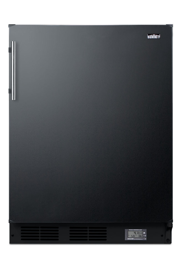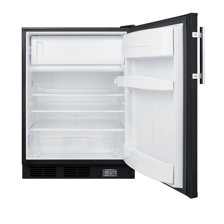 SUMMIT's selection of break room refrigeration features a variety of units for convenient and reliable storage in hospitals, clinics, and other facilities. The BKRF663B is a counter height refrigerator-freezer made in Europe and sized with a 24" footprint. It features a black exterior finish and stainless steel handle, with a user-reversible door swing for added flexibility. A factory-installed NIST calibrated thermometer is located in the kickplate to provide a continuous display of the current and high/low temperatures of the refrigerator compartment to the nearest tenth of a degree. Temperature can be viewed in Celsius or Fahrenheit for added convenience. The device also includes an audible alarm to warn of major temperature fluctuations. Inside, the BKRF663B features a dual evaporator to allow separated cooling of the fresh and frozen food sections. The refrigerated compartment utilizes low maintenance automatic defrost, while the interior freezer compartment is manual defrost to achieve lower storage temperatures ideal for frozen food. Additional features include adjustable glass shelves, a crisper drawer, door racks for condiments and tall bottles, and an automatic interior light. The BKRF663B is designed for freestanding use. For a built-in version, see the BKRF663BBI. Additional styles and ADA compliant sizes are available. Note: Model prefix "BKRF" is a marketing designation. Actual unit will carry Summit model number CT663B.