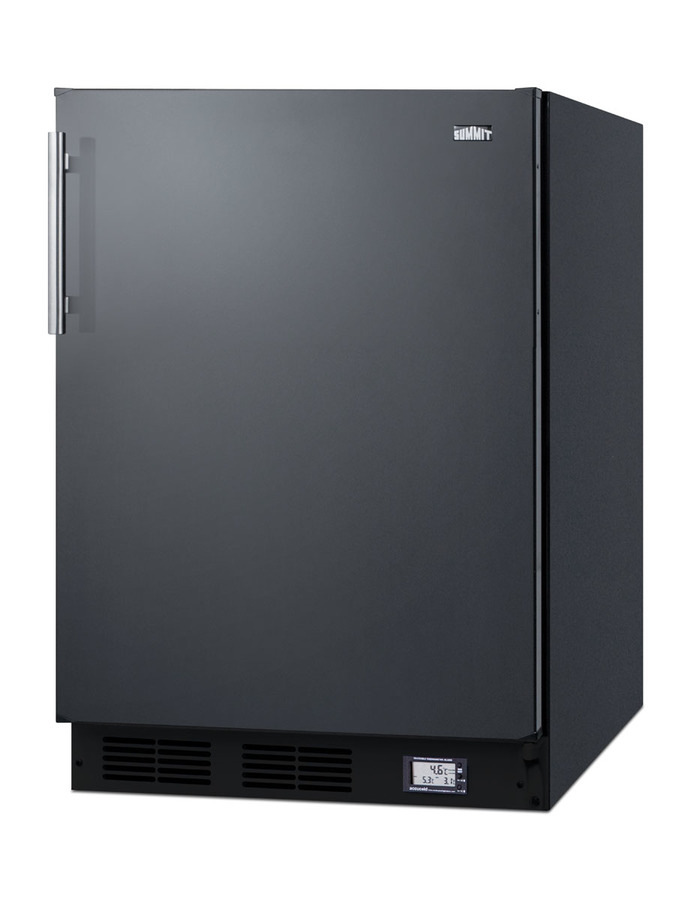 SUMMIT's selection of break room refrigeration features a variety of units for convenient and reliable storage in hospitals, clinics, and other facilities. The BKRF663BBIADA is a built-in undercounter refrigerator-freezer made in Europe and sized with a 24" footprint. It features a black exterior finish and stainless steel handle, with a user-reversible door swing for added flexibility. A factory-installed NIST calibrated thermometer is located in the kickplate to provide a continuous display of the current and high/low temperatures of the refrigerator compartment to the nearest tenth of a degree. Temperature can be viewed in Celsius or Fahrenheit for added convenience. The device also includes an audible alarm to warn of major temperature fluctuations. Inside, the BKRF663BBIADA features a dual evaporator to allow separated cooling of the fresh and frozen food sections. The refrigerated compartment utilizes low maintenance automatic defrost, while the interior freezer compartment is manual defrost to achieve lower storage temperatures ideal for frozen food. Additional features include adjustable glass shelves, a crisper drawer, door racks for condiments and tall bottles, and an automatic interior light. The BKRF663BBIADA features a front-breathing design for built-in installation under counters, but can also be used freestanding. This unit is sized at 32" high for use under lower ADA compliant counter spaces. For this unit in white, see the BKRF661BIADA. Note: Model prefix "BKRF" is a marketing designation. Actual unit will carry Summit model number CT663BBIADA.