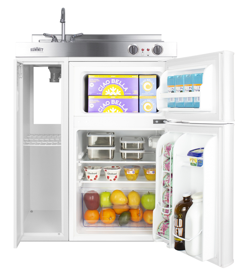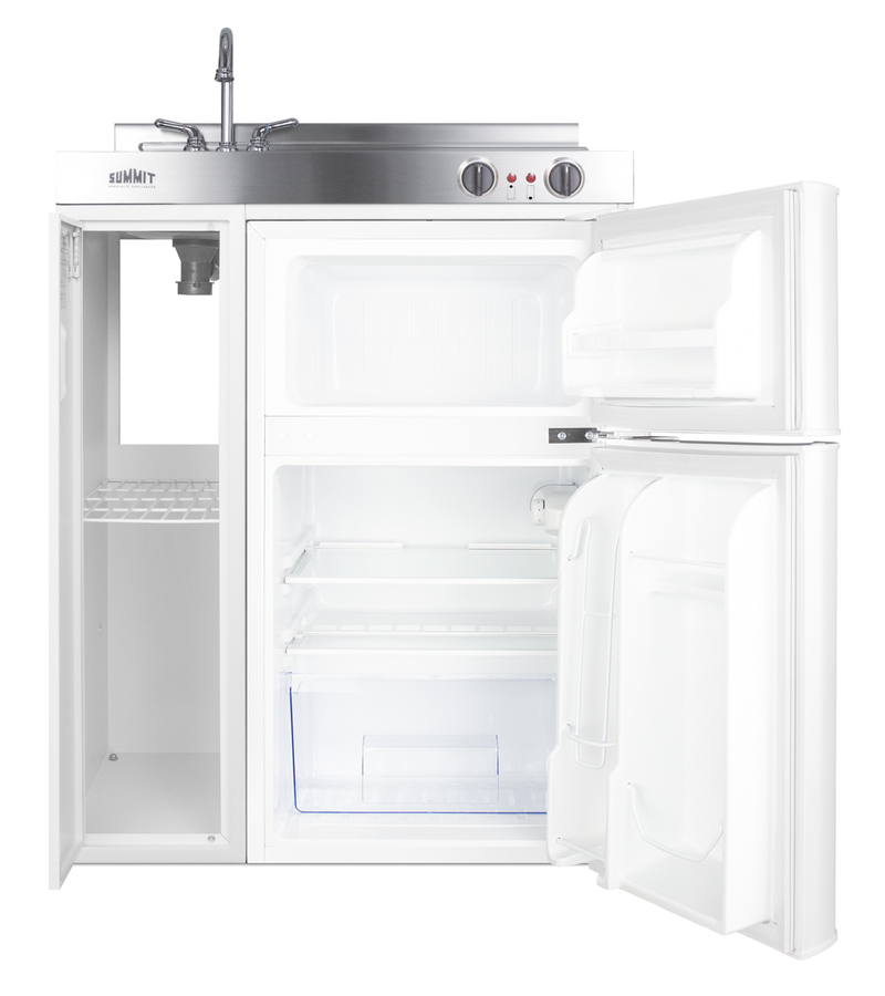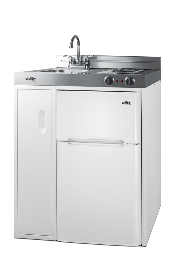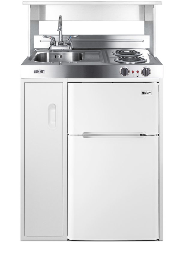 Summit brings true convenience to smaller spaces with all-in-one combination kitchenettes. Available from 30" to 72" wide, these units come fully featured with everything you need for the home foodservice experience, including a 2-burner cooktop, sink, storage cabinet, and refrigerator with a freezer compartment. The C30EL is a 30" wide kitchenette with an easy-fitting 24" depth. The 115V cooktop features two coil elements, with front-located knobs for easy cooking and a preinstalled cord. The stainless steel surface countertop offers durability with a professional look. This unit includes a compact sink with ready-to-use faucet included. A cabinet with a removable shelf is located below the sink for dry storage. Unlike many other brands' kitchenettes, all Summit units include a refrigerator with a freezer compartment to cover all of your cold storage needs. The C30EL includes the two-door, ENERGY STAR certified CP34W, with 3.2 cu.ft. of storage space. A dual evaporator system separately cools the auto defrost refrigerator section and manual defrost freezer compartment for improved overall performance. This model also includes an adjustable glass shelf, door storage, and a crisper. The C30EL is packaged and shipped in one box. Perfect for studio apartments, hotel rooms, dormitories, assisted living facilities, temporary kitchen facilities, and any other location in need of a low maintenance, fully featured compact kitchenette at one great price.