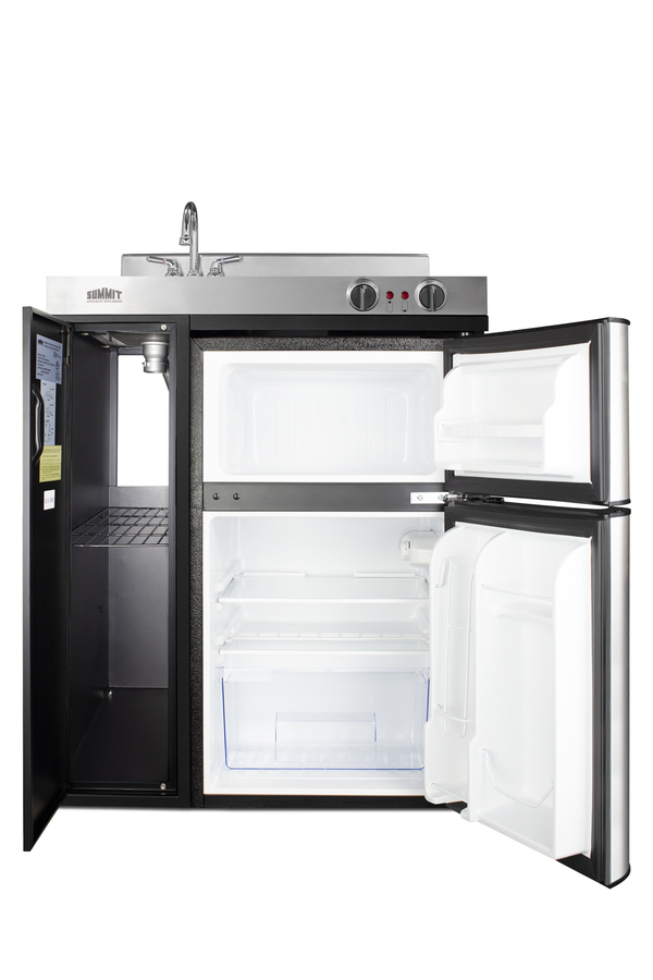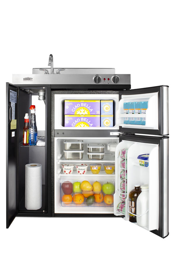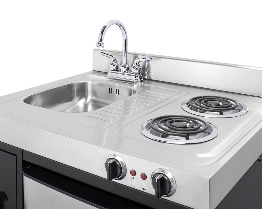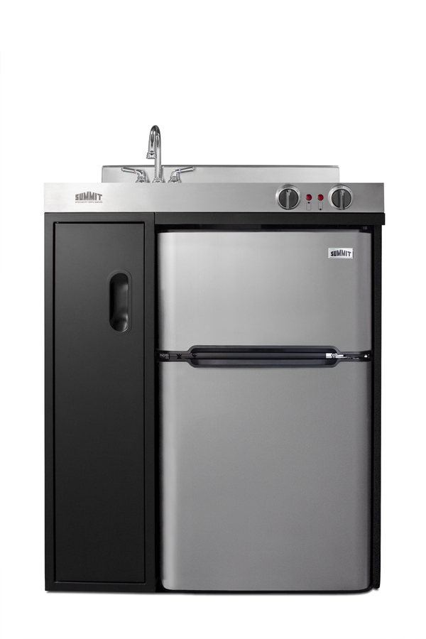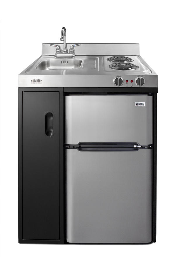 Summit brings true convenience to smaller spaces with all-in-one combination kitchenettes. Available in a variety of sizes and finishes, these units come fully featured with everything you need for the home foodservice experience, including a 2-burner coil cooktop, sink, storage cabinet, and refrigerator with a freezer compartment. The C30ELBK is a 30" wide kitchenette with an easy-fitting 24" depth. Its black exterior brings a modern look to efficiency spaces, with added touches of stainless steel on the kitchenette work surface and refrigerator doors. It comes fully equipped with a 115V cooktop with 900W and 500W coil elements, front-located push-to-turn knobs, and a preinstalled power cord. This unit includes a compact sink with ready-to-use faucet included. A cabinet with a removable shelf is located below the sink for dry storage. Unlike many other brands' kitchenettes, all Summit units include a refrigerator with a freezer compartment to cover all of your cold storage needs. The C30ELBK includes the two-door, ENERGY STAR certified CP34BSS, with 3.2 cu.ft. of storage space. A dual evaporator system separately cools the auto defrost refrigerator section and manual defrost freezer compartment for improved overall performance. This model also includes an adjustable glass shelf, door storage, and a crisper. The C30ELBK is packaged and shipped in one box. Perfect for studio apartments, hotel rooms, dormitories, assisted living facilities, temporary kitchen facilities, and any other location in need of a low maintenance, fully-featured compact kitchenette at one great price.