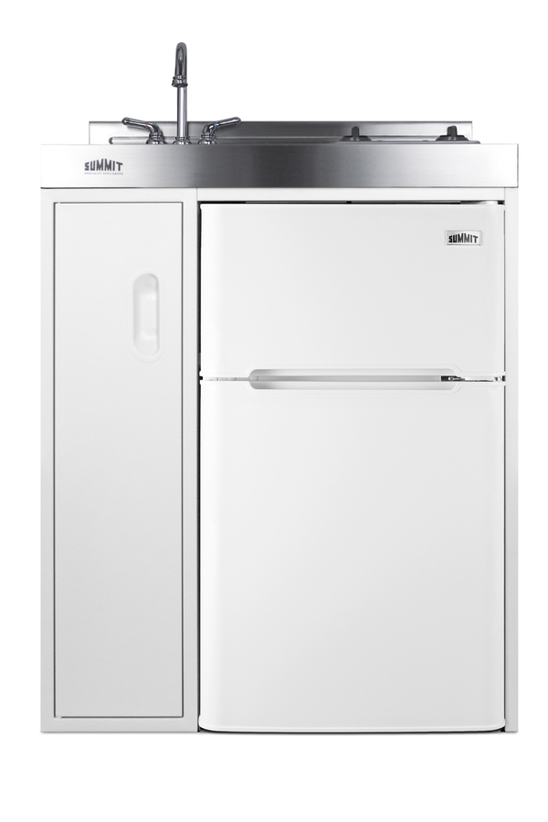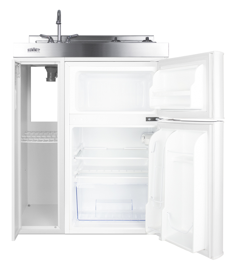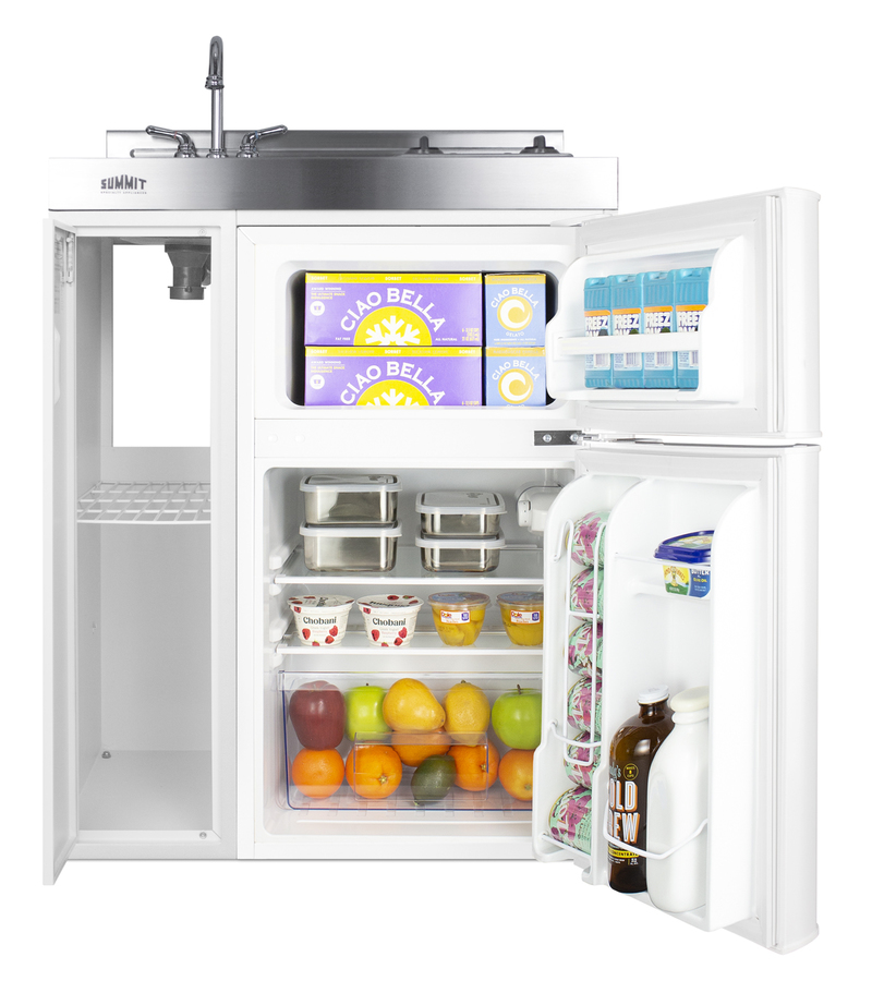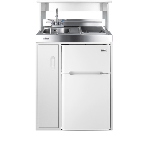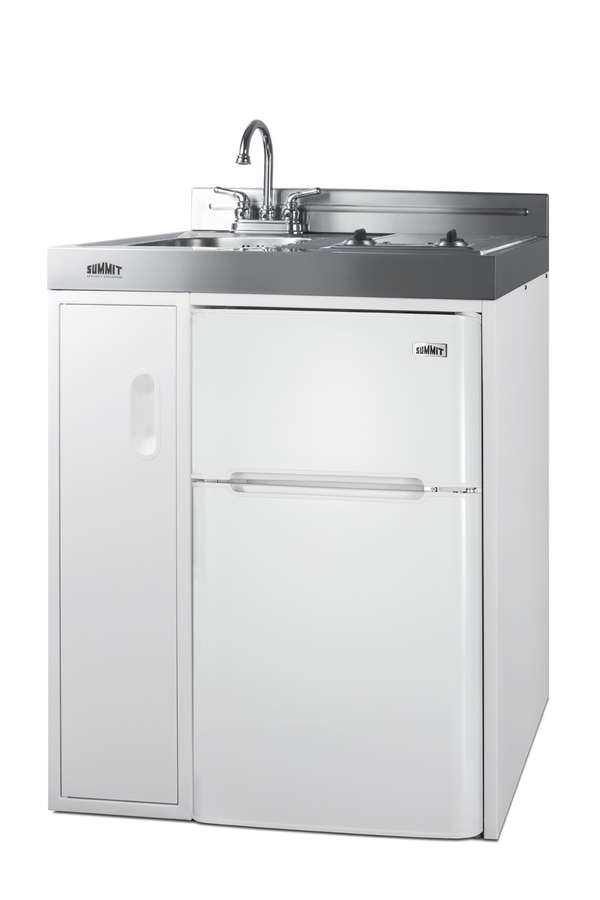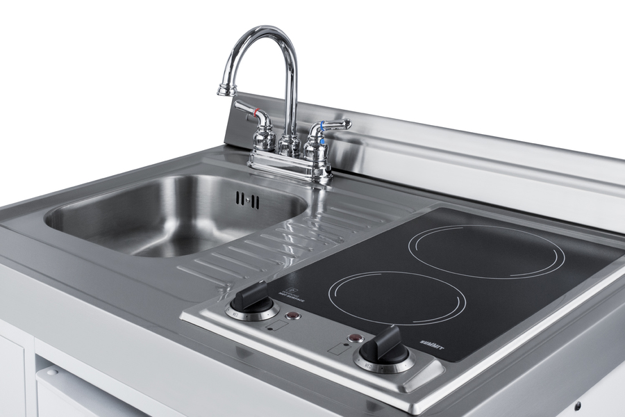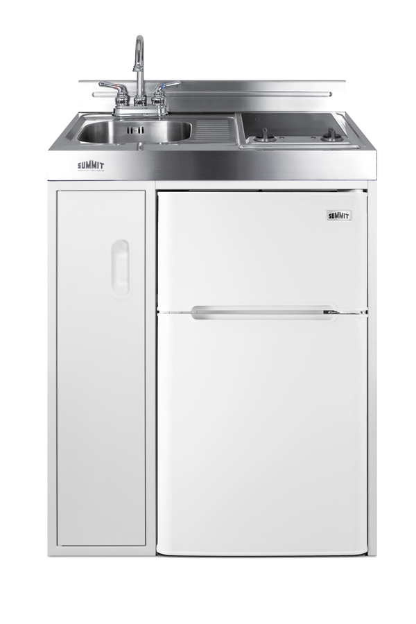 Summit brings true convenience to smaller spaces with all-in-one combination kitchenettes. Available in a variety of sizes and finishes, these units come fully featured with everything you need for the home foodservice experience, including a 2-burner coil cooktop, sink, storage cabinet, and refrigerator with a freezer compartment. The C30ELGLASS is a 30" wide kitchenette with an easy-fitting 24" depth. The 115V radiant cooktop features a smooth black glass surface with a 6" 600W and 7" 900W heating element and pre-installed cord. The stainless steel surface countertop offers durability with a professional look. This unit includes a compact sink with ready-to-use faucet included. A cabinet with a removable shelf is located below the sink for dry storage. Unlike many other brands' kitchenettes, all Summit units include a refrigerator with a freezer compartment to cover all of your cold storage needs. The C30ELGLASS includes the two-door, ENERGY STAR certified CP34W, with 3.2 cu.ft. of storage space. A dual evaporator system separately cools the auto defrost refrigerator section and manual defrost freezer compartment for improved overall performance. This model also includes an adjustable glass shelf, door storage, and a crisper. The C30ELGLASS is packaged and shipped in one box. Perfect for studio apartments, hotel rooms, dormitories, assisted living facilities, temporary kitchen facilities, and any other location in need of a low maintenance, fully featured compact kitchenette at one great price.