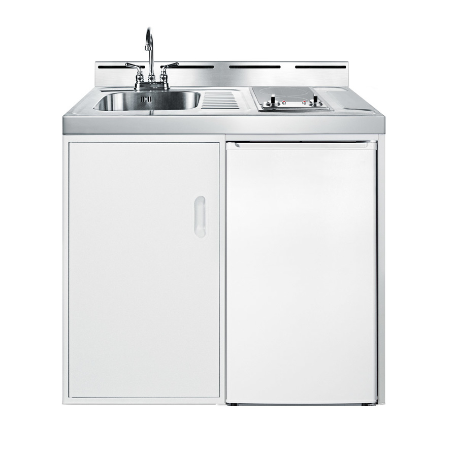 Summit brings true convenience to smaller spaces with all-in-one combination kitchenettes. Available in four sizes, these units come fully featured with everything you need for the home foodservice experience, including a 2-burner cooktop, sink, storage cabinet, and refrigerator with a freezer compartment. The C39ELAUTOGLASS is a 39" wide kitchenette with an easy-fitting 24" depth. The 115V radiant cooktop features a smooth black ceramic glass surface with 6" 600W and 7" 900W heating elements and pre-installed cord. The stainless steel countertop offers durability with a professional look. This unit includes a compact sink with ready-to-use faucet included. A cabinet with a removable shelf is located below the sink for dry storage. Unlike our competitors, who rarely offer freezers on compact kitchenettes, the C39ELAUTOGLASS includes the FF412ES refrigerator with a freezer compartment. The ENERGY STAR certified refrigerator-freezer is made in North America and utilizes automatic defrost for minimum user maintenance. The C39ELAUTOGLASS is packaged and shipped in one box. Perfect for studio apartments, hotel rooms, dormitories, assisted living facilities, temporary kitchen facilities, and any other location in need of a low maintenance, fully featured compact kitchenette.