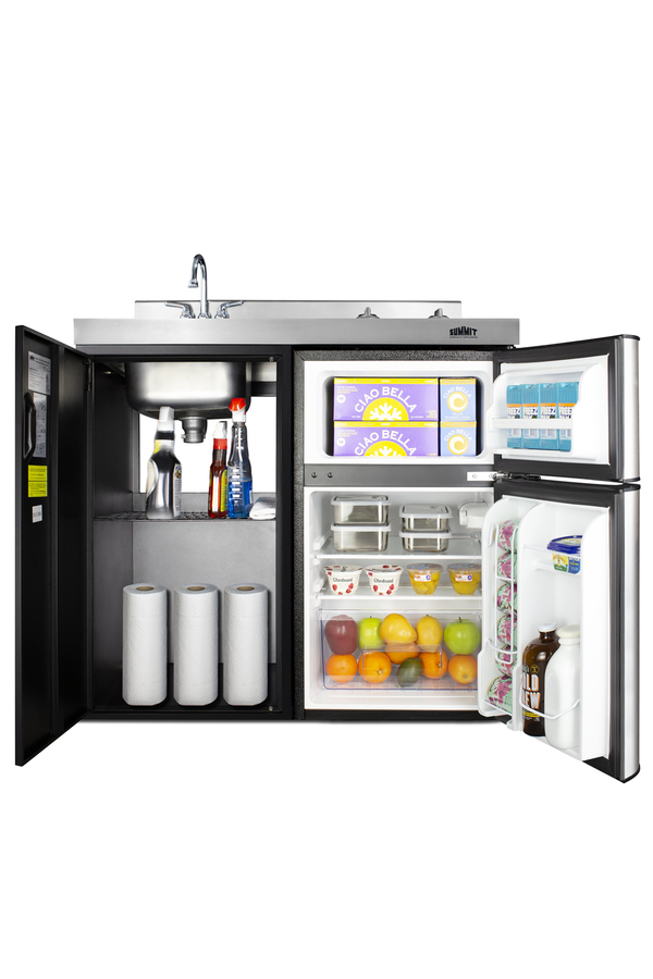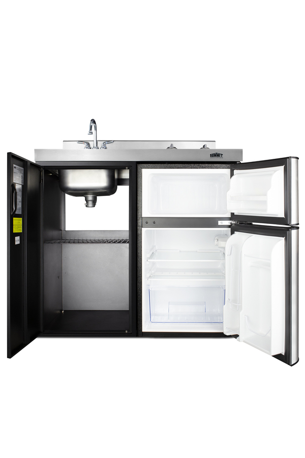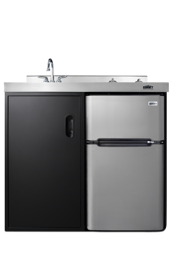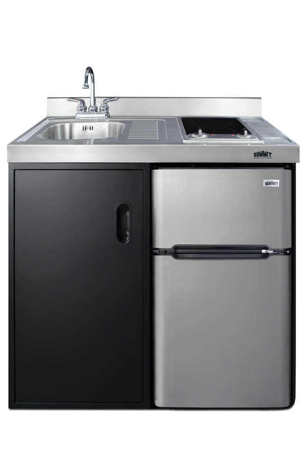 Summit brings true convenience to smaller spaces with all-in-one combination kitchenettes. Available in a variety of sizes and finishes, these units come fully featured with everything you need for the home foodservice experience, including a 2-burner smooth-top cooktop, sink, storage cabinet, and refrigerator with a freezer compartment. The C39ELGLASSBK is a 39" wide kitchenette with an easy-fitting 24" depth. Its black exterior brings a modern look to efficiency spaces, with added touches of stainless steel on the kitchenette work surface and refrigerator doors. This unit includes a built-in 115V smooth-top cooktop with a 6" 600W and 7" 900W heating element. The power cord comes pre-installed for easy setup. The left side of the kitchenette features a compact sink with ready-to-use faucet. A cabinet with a removable shelf is located below the sink for dry storage. Unlike many other brands' kitchenettes, all Summit units include a refrigerator with a freezer compartment to cover all of your cold storage needs. The C39ELGLASSBK includes the two-door, ENERGY STAR certified CP34BSS, with 3.2 cu.ft. of storage space. A dual evaporator system separately cools the auto defrost refrigerator section and manual defrost freezer compartment for improved overall performance. This model also includes an adjustable glass shelf, door storage, and a crisper. The C39ELGLASSBK is packaged and shipped in one box. Perfect for studio apartments, hotel rooms, dormitories, assisted living facilities, temporary kitchen facilities, and any other location in need of a low maintenance, fully-featured compact kitchenette.