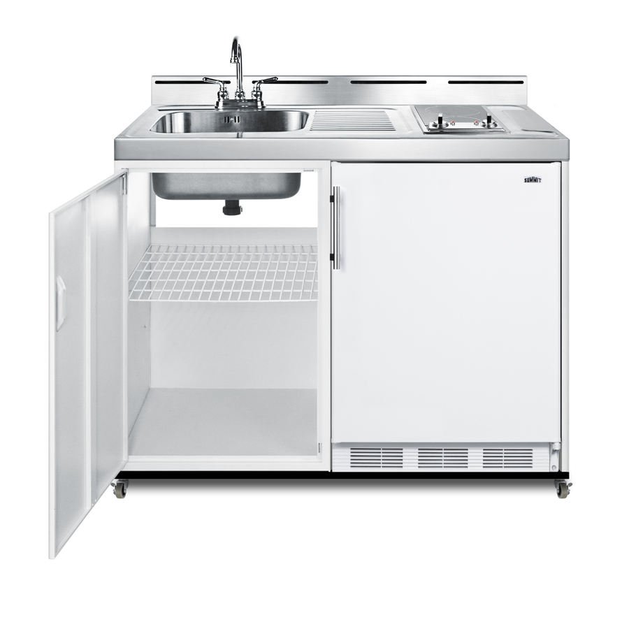 Summit brings innovation and convenience to non-traditional kitchen spaces with a new line of all-in-one kitchenettes designed for portable use in settings without standard water lines. Great for efficiency housing, off-grid living, and temporary or basement kitchens, the C48ELGLASSPUMPMB is a mobile 48 inch wide kitchenette composed of a refrigerator-freezer, 2-burner coil cooktop, sink, and storage cabinet that can be used as a portable water station. We include CKPUMPKIT, a package that features everything you need to connect the sink to a removable 5 gallon water jug to pump your fresh water through the included faucet. The kit comes with a 5 gallon jug, 6 gallon waste water container, 110V water pump, and all of the hardware and tubing you need to install your own "no plumbing" sink. The C48ELGLASSPUMPMB features a smooth 2-burner radiant cooktop in black glass for convenient stovetop heating. The cooktop includes its own pre-installed 3-prong cord for easy setup. It ships with our popular CT661W European refrigerator-freezer, offering 5.1 cu.ft. of storage capacity with adjustable glass shelves, door racks, a scalloped steel wine shelf, and large crisper drawer ideal for keeping produce at its best. Sized just under 48 inches wide, the C48ELGLASSPUMPMB comes in a shallow 24 inch depth ideal for smaller kitchens. Factory-installed casters allow you to smoothly move the unit as needed, with the front two casters equipped with locks to stay in place. This unit features a classic white cabinet finish with a durable stainless steel work surface and backguard. For more storage options, add our APSS48 appliance station shelf or our selection of wall cabinets. This unit ships on one pallet in three overboxed packages (kitchenette, refrigerator, and pump kit). Just slide the refrigerator in, install the pump kit, plug in the appliances, and enjoy your fully functional efficiency kitchen with no plumbing required!