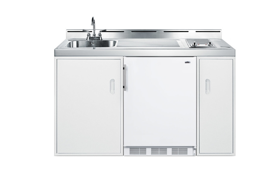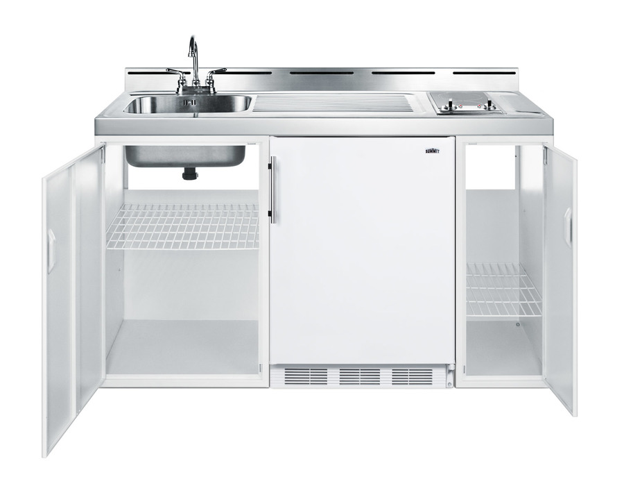 Summit brings true convenience to smaller spaces with all-in-one combination kitchenettes. Available in a variety of sizes and finishes, these units come fully featured with everything you need for the home foodservice experience, including a 2-burner coil cooktop, sink, storage cabinet, and refrigerator with a freezer compartment. The C60ELGLASS is our deluxe combination kitchen in a full 60" width. At 24" deep, it leaves you plenty of room to navigate while preparing food on an easy-to-clean smoothtop cooktop with two 120V burners. SUMMIT CT661W, one of our most popular compact refrigerator-freezers, slides in under the counter. This unit uses SUMMIT's exclusive dual evaporator cooling, for energy efficiency with quality results. Automatic defrost eases maintenance in the refrigerator section and a manual defrost zero degree freezer keeps even ice cream frozen. Adjustable glass shelves, door storage, a wine shelf, and a crisper provide added storage options. Two cabinets provide ample space for dry storage. This unit includes a stainless steel work surface with a sink and faucet. Our all-in-one combination kitchens ship fully assembled in two boxes. Just slide the refrigerator in and start serving. Perfect for studio apartments, hotel rooms, dormitories, assisted living facilities, and any other location in need of a full kitchen area at one great price.