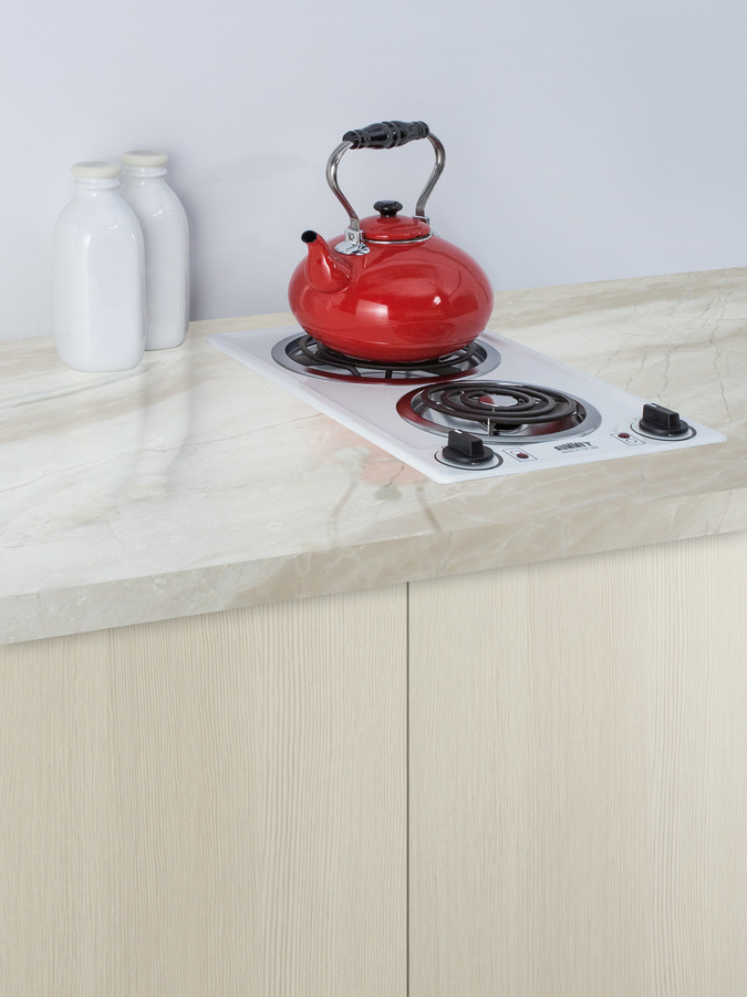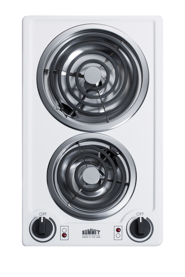 Summit offers an extensive selection of slim-fitting cooktops designed and manufactured in the USA. The CCE211WH is a 115V cooktop with a porcelain surface in a classic white finish. Two coil elements (6" 600W in front and 8" 900W in rear) offer durable heating, with removable chrome drip pans included. The push-to-turn knobs are simple and intuitive, with indicator lights that show which burner is in use for added safety. The recessed design helps to contain spills for a cleaner cooking experience. This cooktop includes a 3-pronged 4' long power cord for convenient installation. It is designed to fit common 11 1/8" W x 19 1/8" D counter cutouts. Additional choices are available in black and stainless steel, as well as radiant, induction, and gas cooktops in similar sizes. Browse our website for our complete selection of slim-fitting cooking appliances.