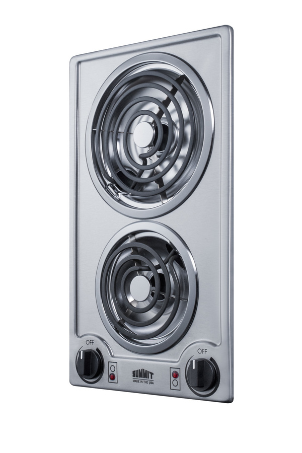 Summit offers an extensive selection of slim-fitting cooktops designed and manufactured in the USA. The CCE213SS is a 115V cooktop with a durable surface in brushed stainless steel. Two coil elements (6" 600W in front and 8" 900W in rear) offer durable heating, with removable chrome drip pans included. The push-to-turn knobs are simple and intuitive, with indicator lights that show which burner is in use for added safety. The recessed design helps to contain spills for a cleaner cooking experience. This cooktop includes a 3-pronged 4' long power cord for convenient installation. It is designed to fit common 11 1/8" W x 19 1/8" D counter cutouts. Additional choices are available in white and black, as well as radiant, induction, and gas cooktops in similar sizes. Browse our website for our complete selection of slim-fitting cooking appliances.