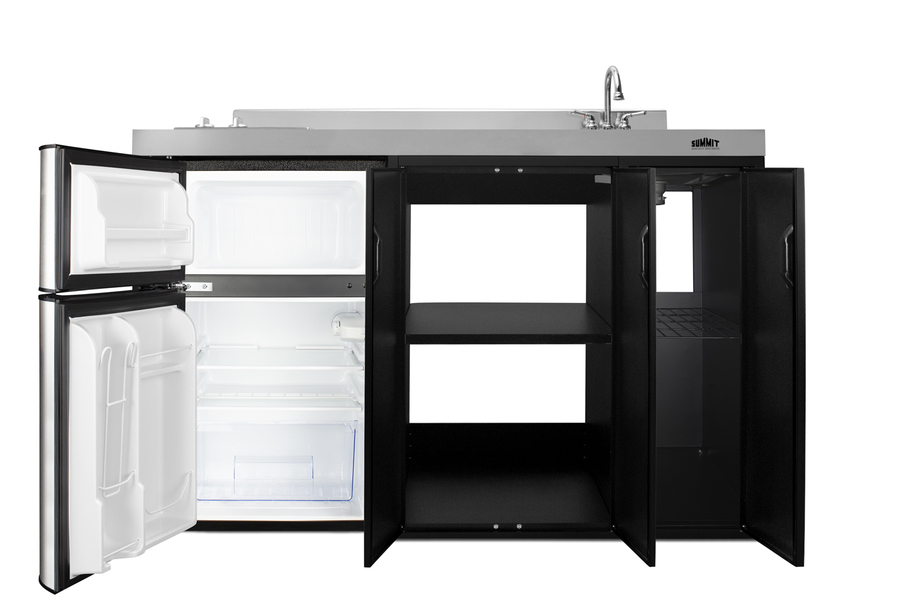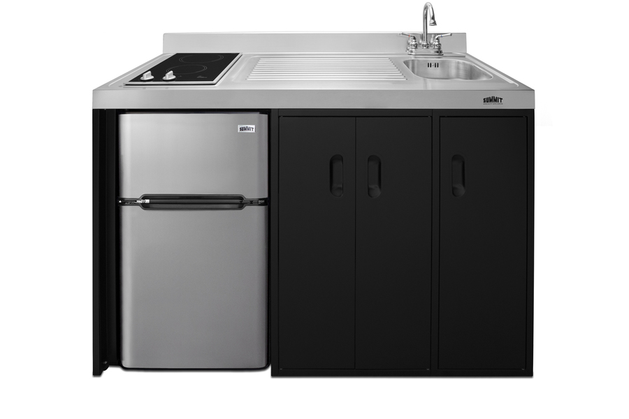 Summit brings true convenience to smaller spaces with all-in-one combination kitchenettes. Available in a variety of sizes and finishes, these units come fully featured with everything you need for the home foodservice experience, including a 2-burner smooth-top cooktop, sink, storage cabinets, and refrigerator with a freezer compartment. The CK54SINKR is 54" wide with an easy-fitting 24" depth. Its black exterior brings a modern look to efficiency spaces, with added touches of stainless steel on the kitchenette work surface and refrigerator doors. This unit includes a built-in 115V smooth-top cooktop with a rear 7" 900W and a front 5½" 500W heating element. The power cord comes pre-installed for easy setup. The right side of the kitchenette features a compact sink with ready-to-use faucet. A single-door cabinet under the sink includes a removable wire shelf, perfect for storing cleaning supplies, while a French-door style cabinet under the work surface has a solid removable shelf, ideal for dry storage. Two grooved handles on each side allow for easy movement of the unit. Unlike many other brands' kitchenettes, all Summit units include a refrigerator with a freezer compartment to cover all of your cold storage needs. The CK54SINKR includes the two-door, ENERGY STAR certified CP34BSS, with 3.2 cu.ft. of storage space. A dual evaporator system separately cools the auto defrost refrigerator section and manual defrost freezer compartment for improved overall performance. This model also includes an adjustable glass shelf, door storage, and a crisper. The CK54SINKR is packaged and shipped in one box. Perfect for studio apartments, hotel rooms, dormitories, assisted living facilities, temporary kitchen facilities, and any other location in need of a low maintenance, fully-featured compact kitchenette. For this unit with a sink located on the left of the kitchenette, see the CK54SINKL. Note: For users who prefer a gas connection, Summit model GC22SS can fit inside the existing 11" W x 19 1/4" D cooktop cutout. Additionally, users can remove the center storage cabinet and install an 18" wide ADA compliant dishwasher, such as Summit model DW18SS4ADA. See the instructions in the "DOWNLOADS" section of this page.
