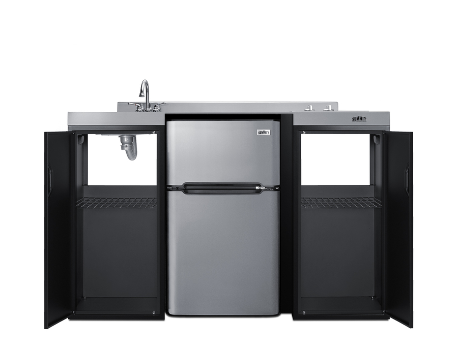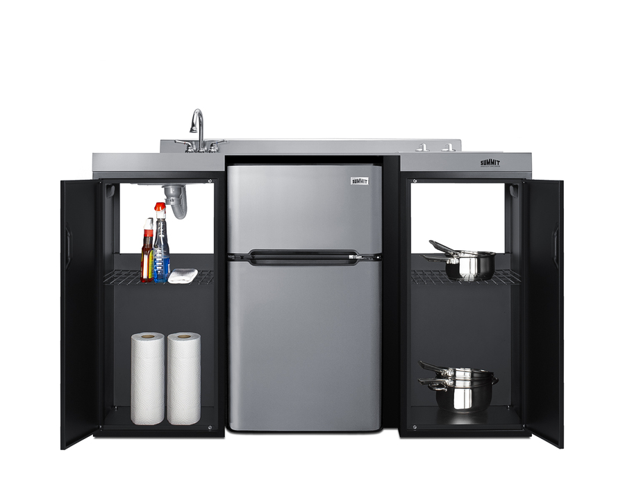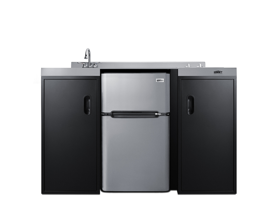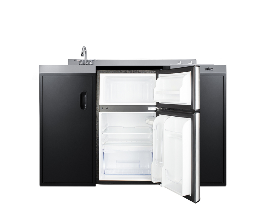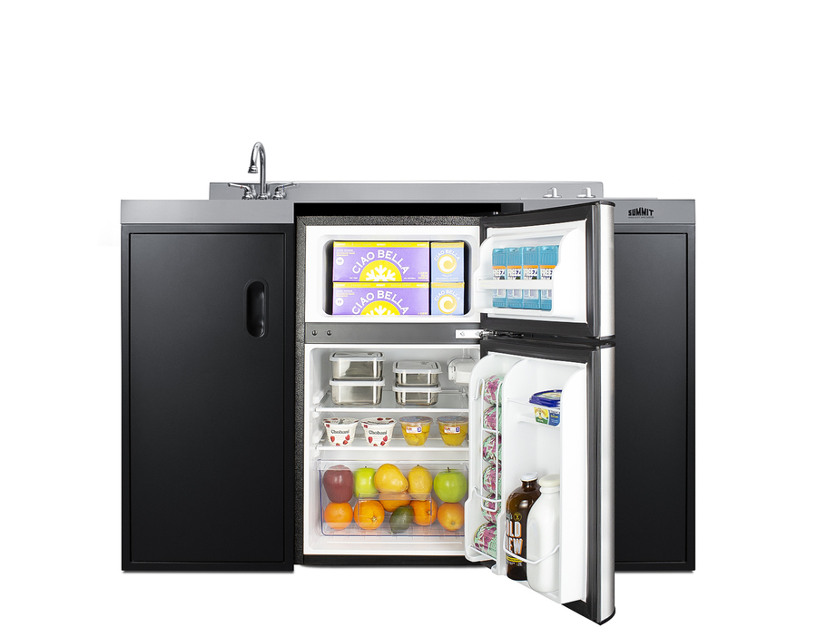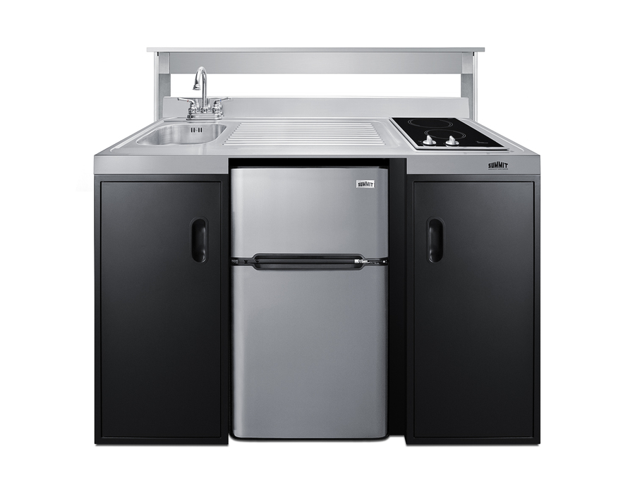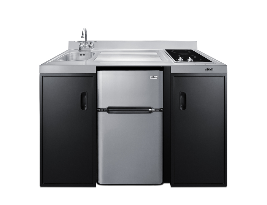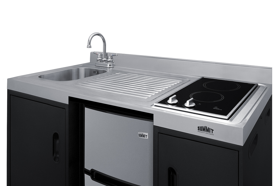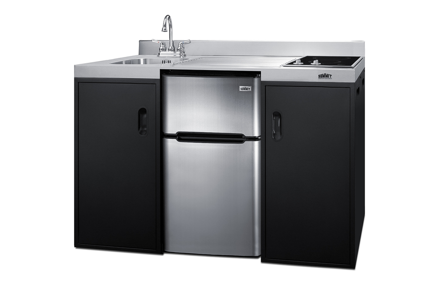 Summit brings true convenience to smaller spaces with all-in-one combination kitchenettes. Available in a variety of sizes and finishes, these units come fully featured with everything you need for the home foodservice experience, including a 2-burner smooth-top cooktop, sink, storage cabinets, and refrigerator with a freezer compartment. The CK55ADASINKL is 54" wide in an easy-fitting 24" depth. The counter is sized at 34" high to comply with ADA guidelines for user accessibility. Its black exterior brings a modern look to efficiency spaces, with added touches of stainless steel on the kitchenette work surface and refrigerator doors. This unit includes a built-in 115V smooth-top cooktop with a rear 7" 900W and a front 5½" 500W heating element. The power cord comes pre-installed for easy setup. The right side of the kitchenette features a compact sink with ready-to-use faucet. A single-door cabinet under the sink includes a removable wire shelf, perfect for storing cleaning supplies, while a French-door style cabinet under the work surface has a solid removable shelf, ideal for dry storage. Two grooved handles on each side allow for easy movement of the unit. Unlike many other brands' kitchenettes, all Summit units include a refrigerator with a freezer compartment to cover all of your cold storage needs. The CK55ADASINKL includes the two-door, ENERGY STAR certified CP34BSS, with 3.2 cu.ft. of storage space. A dual evaporator system separately cools the auto defrost refrigerator section and manual defrost freezer compartment for improved overall performance. This model also includes an adjustable glass shelf, door storage, and a crisper. The CK55ADASINKL is packaged and shipped in one box. Perfect for studio apartments, hotel rooms, dormitories, assisted living facilities, temporary kitchen facilities, and any other location in need of low maintenance, fully-featured compact kitchenette. For this unit with a sink located on the right of the kitchenette, see the CK55ADASINKR. Additional styles are available in a range of choices, as well as storage accessories including matching wall cabinets and appliance shelves.