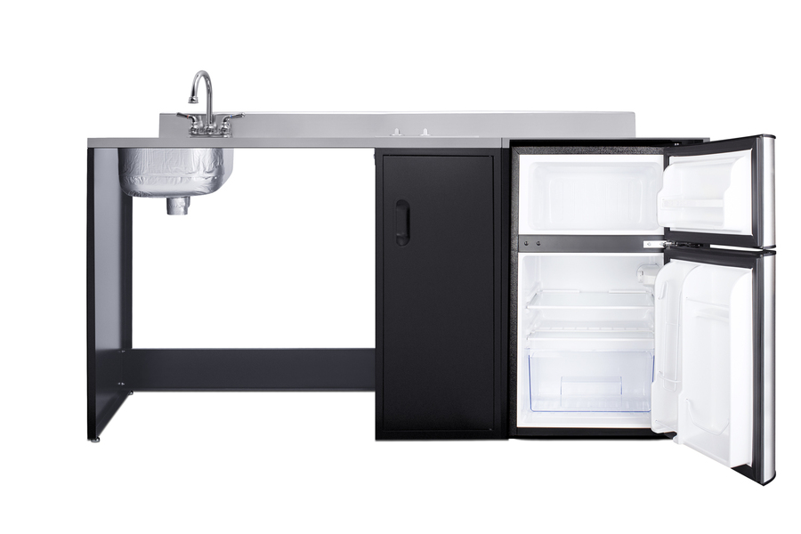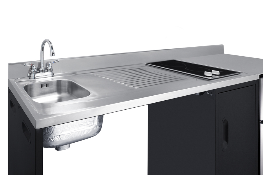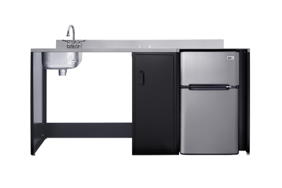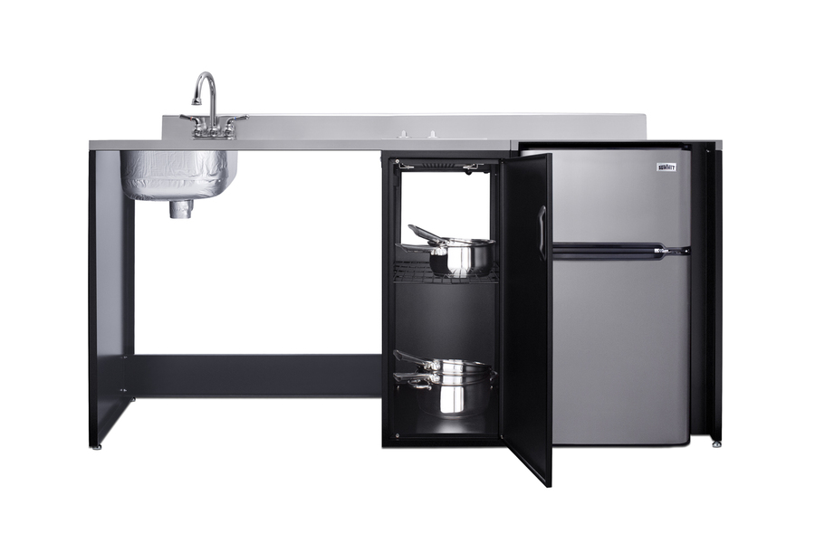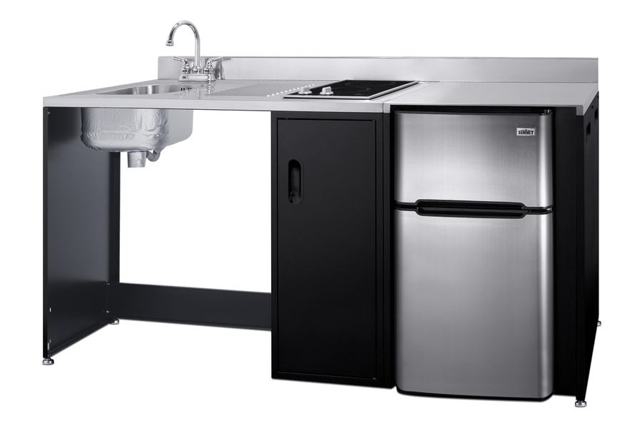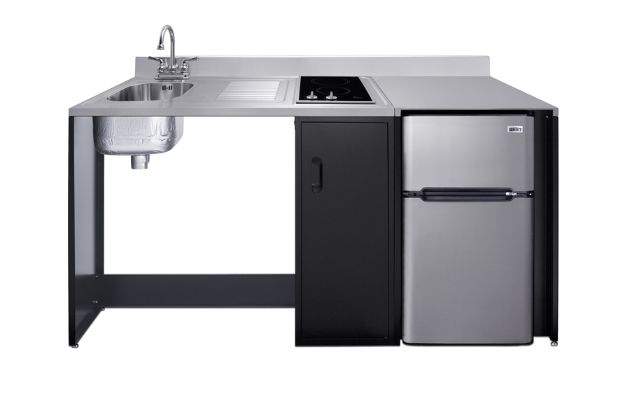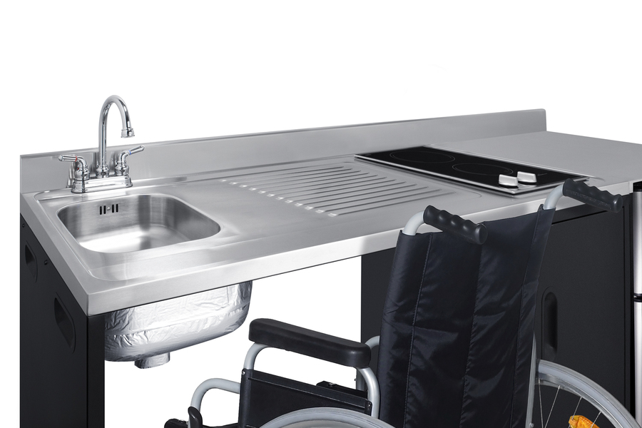 Summit brings true convenience and accessibility to smaller spaces with our collection of barrier-free, all-in-one combination kitchenettes. Available in a variety of sizes and finishes, these units come fully featured with everything you need for the ultimate home foodservice experience, including a 2-burner smooth-top cooktop, sink, storage cabinets, refrigerator with a freezer compartment, and a design that thoughtfully considers movement/flow, force needs, and mobility limitations. The CK72ADALBF is a 72" wide all-in-one compact kitchenette with a 34" ADA-compliant counter height and a barrier-free design for added wheelchair accessibility. It has a 31.88" wide open area under the sink to ensure adequate space for wheelchairs. This unit is designed, but not limited to, users with mobility impairments, such as those who use wheelchairs, users who are temporarily impaired, or recovering from a procedure, and can benefit from increased accessibility and enhanced ease of use when accessing the unit’s sink, cooktop, and storage cabinet. Located on the left side of the CK72ADALBF is the stainless steel sink, complete with a gooseneck faucet. Next to the sink is a stainless steel counter area for food prep. On the right of the prep area is a built-in, 115V smooth-top cooktop with a rear 7" 900W and a front 5½" 500W heating element. This cooktop features upfront, ADA-compliant controls and helpful indicator lights. The standard 3-prong power cord comes pre-installed for easy setup. In the middle of the unit are two single-door cabinets that include removable wire shelves, perfect for storing cleaning supplies. Unlike many other brands' kitchenettes, all Summit units include a refrigerator with a freezer compartment to cover all of your cold storage needs. The CK72ADALBF includes the two-door, ENERGY STAR certified CP34BSS, with 3.2 cu.ft. of storage space. A dual evaporator system separately cools the auto defrost refrigerator section and manual defrost freezer compartment for improved overall performance. This refrigerator-freezer also includes an adjustable glass shelf, door storage, and a crisper. The CK72ADALBF ships fully assembled in one box. Two grooved handles on each side allow for easy movement of the unit. Perfect for studio apartments, hotel rooms, dormitories, assisted living facilities, temporary kitchen facilities, and any other location in need of a fully-featured compact kitchenette featuring wheelchair accessibility. For this unit with a sink located on the right of the kitchenette, see the CK72ADARBF. For this unit without the barrier-free design, see the CK72ADASINKL. Additional choices with premium wood construction will be available soon. Browse the full Summit lineup to explore your options.
