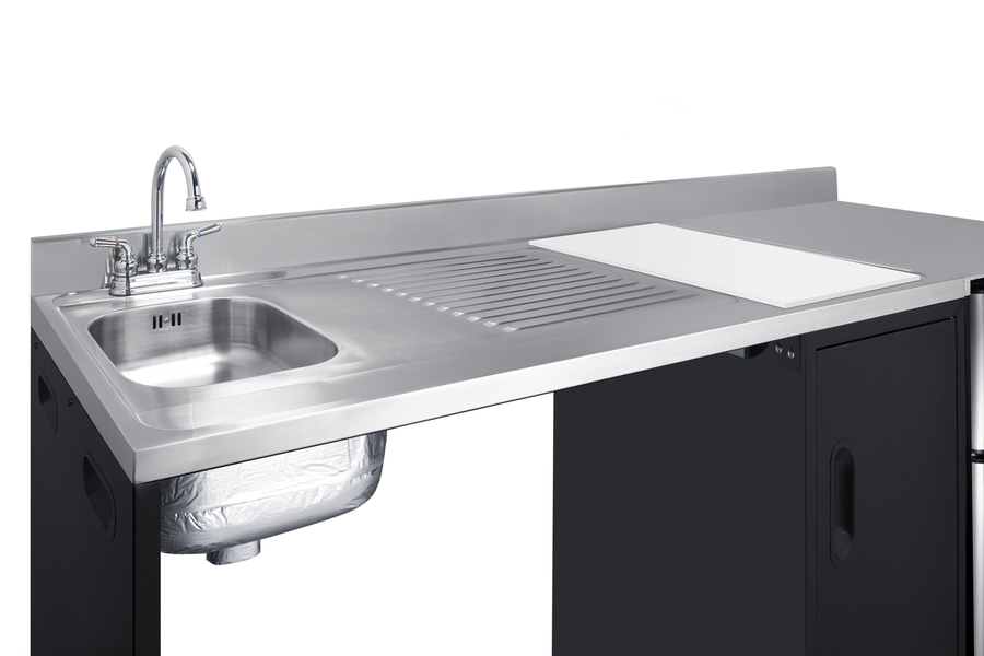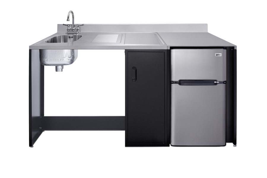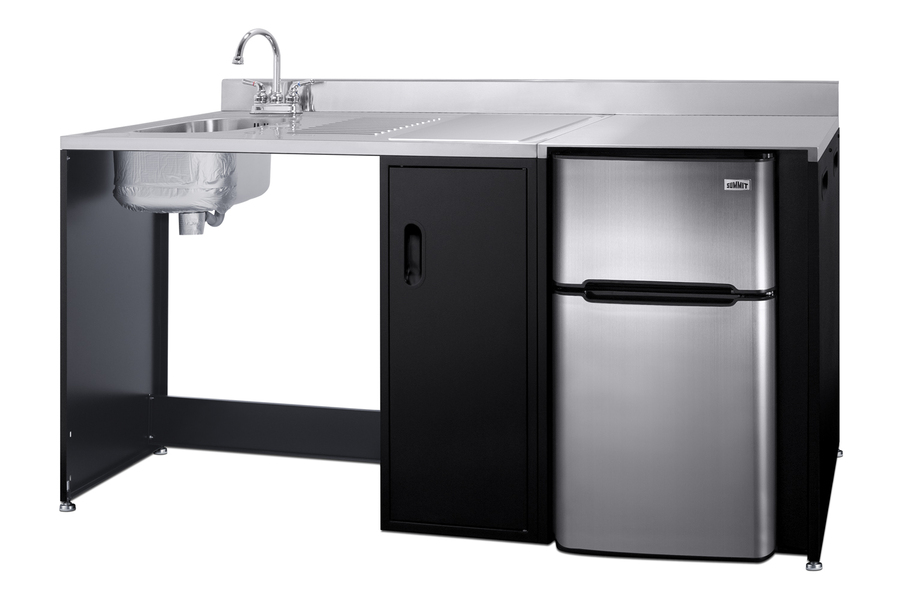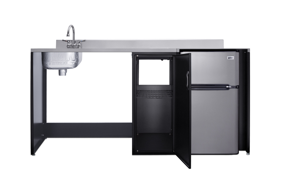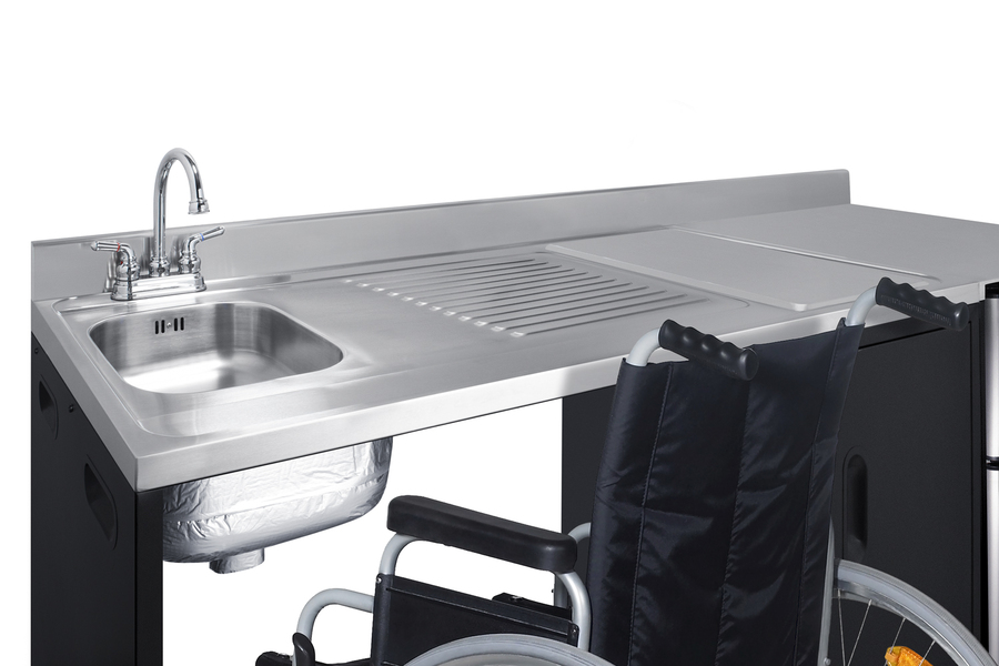 Summit brings true convenience and accessibility to smaller spaces with our collection of barrier-free, all-in-one combination kitchenettes. Available in a variety of sizes and finishes, these units come fully featured with everything you need for the ultimate home foodservice experience, including a stainless steel sink, storage cabinets, refrigerator with a freezer compartment, and a design that thoughtfully considers movement/flow, force needs, and mobility limitations. The CK72ADALBFNCK is a 72" wide all-in-one compact kitchenette with a 34" ADA-compliant counter height and a barrier-free design for added wheelchair accessibility. It has a 31.88" wide open area under the sink to ensure adequate space for wheelchairs. This unit is designed, but not limited to, users with mobility impairments, such as those who use wheelchairs, users who are temporarily impaired, or recovering from a procedure, and can benefit from increased accessibility and enhanced ease of use when accessing the unit’s sink, food prep area, and storage cabinet. Located on the left side of the CK72ADALBFNCK is the stainless steel sink, complete with a gooseneck faucet. Next to the sink is a stainless steel counter area for food prep. The surface includes a small cutlery bin, with a removable cutting board cover to ensure easy food prep. In the middle of the unit are two single-door cabinets that include removable wire shelves, perfect for storing cleaning supplies. Unlike many other brands' kitchenettes, all Summit units include a refrigerator with a freezer compartment to cover all of your cold storage needs. The CK72ADALBFNCK includes the two-door, ENERGY STAR certified CP34BSS, with 3.2 cu.ft. of storage space. A dual evaporator system separately cools the auto defrost refrigerator section and manual defrost freezer compartment for improved overall performance. This refrigerator-freezer also includes an adjustable glass shelf, door storage, and a crisper. The CK72ADALBFNCK ships fully assembled in one box. Two grooved handles on each side allow for easy movement of the unit. Perfect for studio apartments, hotel rooms, dormitories, senior living facilities, temporary kitchen facilities, and any other location in need of a fully-featured compact kitchenette featuring wheelchair accessibility. For this unit with a sink located on the right of the kitchenette, see the CK72ADARBFNCK. For this unit with a 115V cooktop, see model CK72ADALBF. Additional choices with premium wood construction will be available soon. Browse the full Summit lineup to explore your options.