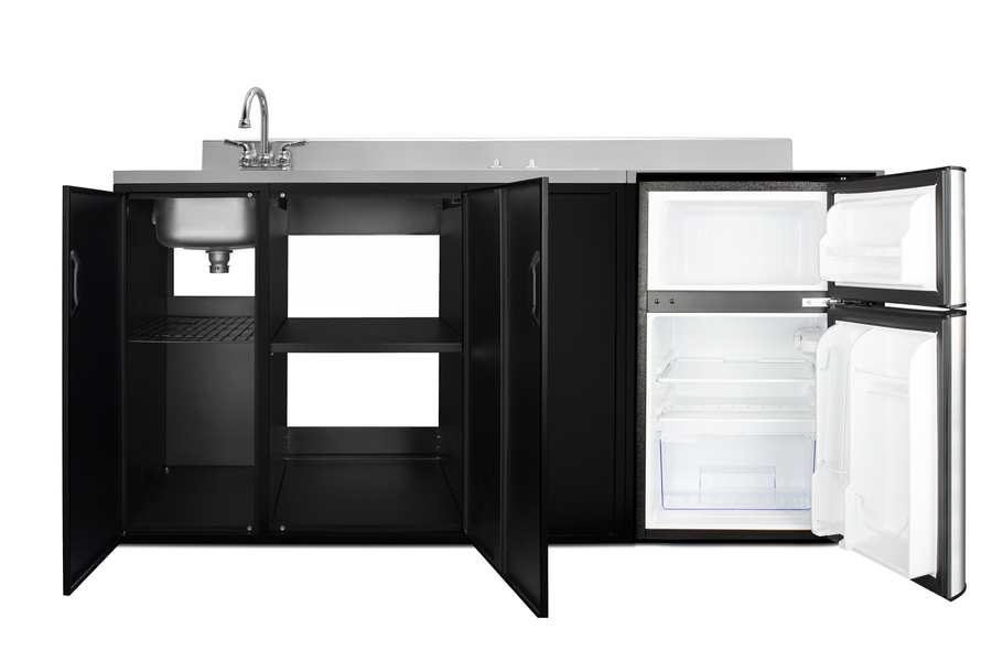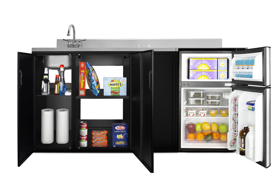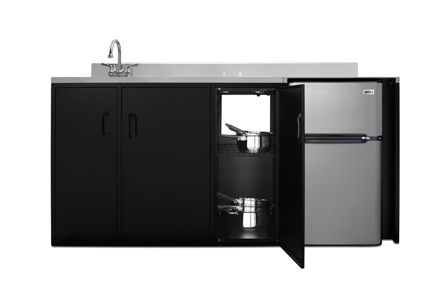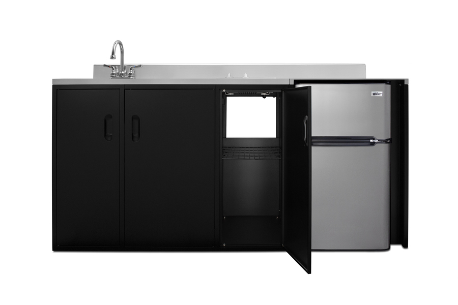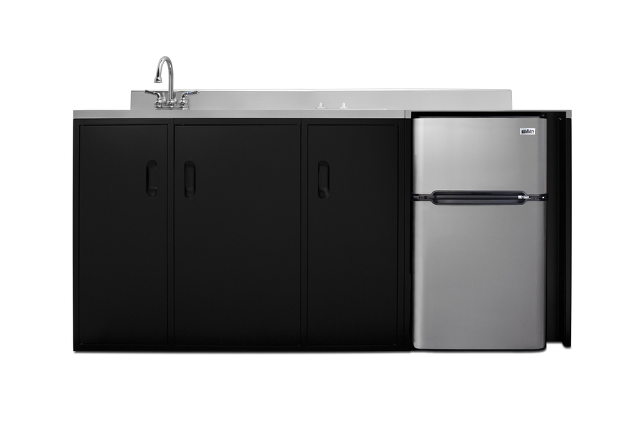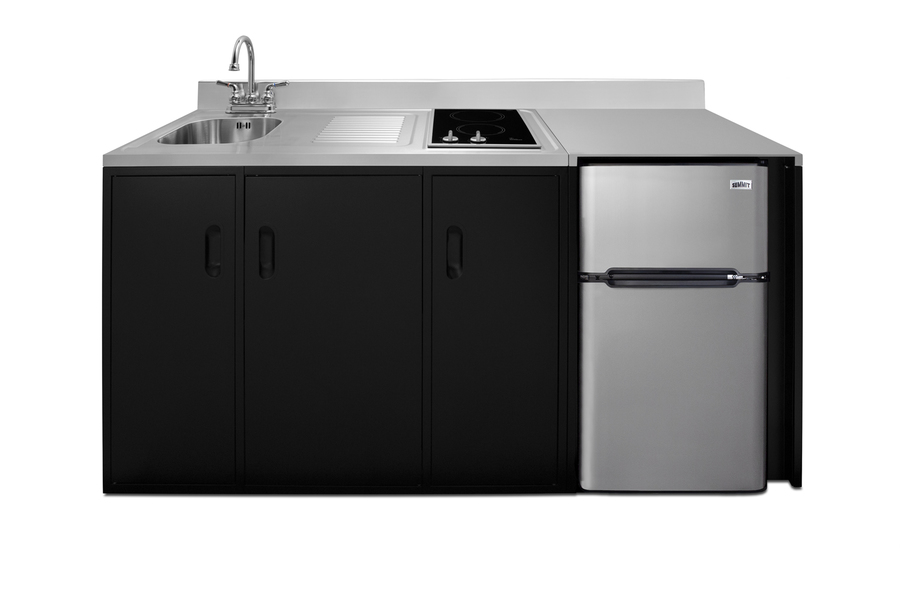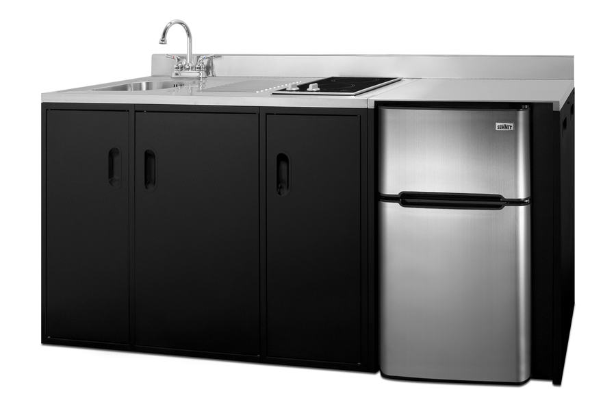 Summit brings true convenience to smaller spaces with all-in-one combination kitchenettes. Available in a variety of sizes and finishes, these units come fully featured with everything you need for the home foodservice experience, including a 2-burner smooth-top cooktop, sink, storage cabinets, and refrigerator with a freezer compartment. The CK72ADASINKL is 72" wide with a 34" ADA counter height for added accessibility. Its black exterior brings a modern look to efficiency spaces, with added touches of stainless steel on the kitchenette work surface and refrigerator doors. This unit includes a built-in 115V smooth-top cooktop with a rear 7" 900W and a front 5½" 500W heating element. The power cord comes pre-installed for easy setup. The left side of the kitchenette features a compact sink with ready-to-use faucet, while the right side has a stainless steel counter area for food prep. Two single-door cabinets include a removable wire shelf, perfect for storing cleaning supplies, while a French-door style cabinet has a sold removable shelf, ideal for dry storage. Two grooved handles on each side allow for easy movement of the unit. Unlike many other brands' kitchenettes, all Summit units include a refrigerator with a freezer compartment to cover all of your cold storage needs. The CK72ADASINKL includes the two-door, ENERGY STAR certified CP34BSS, with 3.2 cu.ft. of storage space. A dual evaporator system separately cools the auto defrost refrigerator section and manual defrost freezer compartment for improved overall performance. This model also includes an adjustable glass shelf, door storage, and a crisper. The CK72ADASINKL is packaged and shipped in one box. Perfect for studio apartments, hotel rooms, dormitories, assisted living facilities, temporary kitchen facilities, and any other location in need of a low maintenance, fully-featured compact kitchenette. For this unit with a sink located on the right of the kitchenette, see the CK72ADASINKR. Note: For users who prefer a gas connection, Summit model GC22SS can fit inside the existing 11" W x 19 1/4" D cooktop cutout. Additionally, users can remove the center storage cabinet and install an 18" wide ADA compliant dishwasher, such as Summit model DW18SS4ADA.