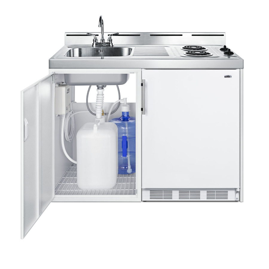 Summit's CKPUMPKIT is an accessory package that lets you create a functioning sink without a standard water line. Designed for use with our all-in-one kitchenettes, the CKPUMPKIT features everything you need to connect a sink to a standard 5 gallon water jug. This kit includes a 5 gallon jug, 6 gallon waste water container, 110V water pump, and all of the hardware and tubing you need to install your own "no plumbing" sink. Great for efficiency housing, off-grid living, and temporary or basement kitchens, the CKPUMPKIT is compatible with Summit's 39", 48", and 60" wide kitchenettes, as well as the 54" wide CK55ADA series.