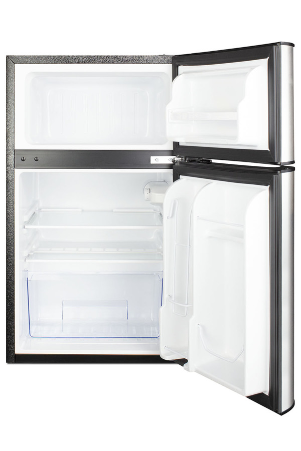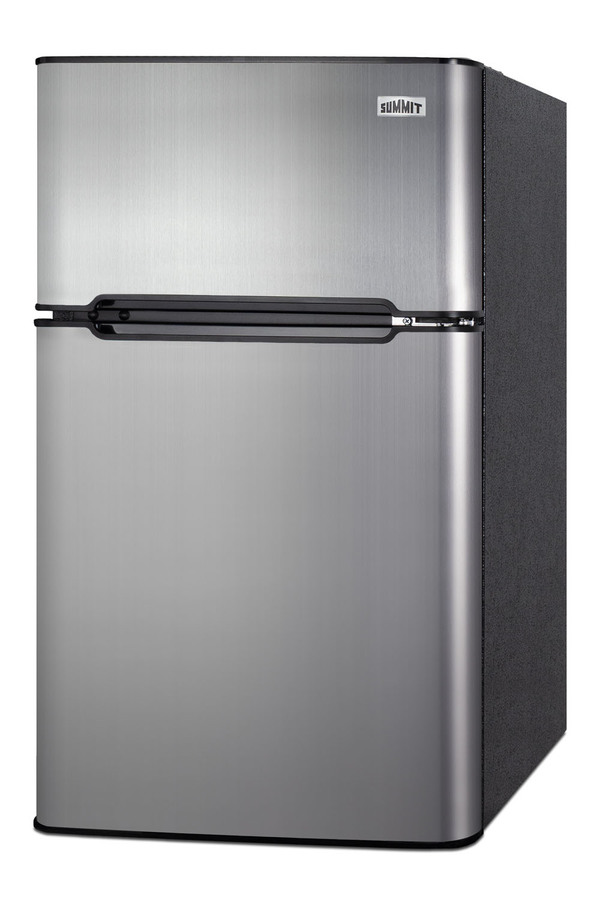 Summit's ENERGY STAR qualified collection of compact refrigerator-freezers offers uniquely sized units with energy-efficient performances. The CP34BSSADA is a freestanding two-door refrigerator-freezer sized at 19" wide. The cabinet is 32 5/8" high, with an additional 1/8" hinge cover for use in ADA compliant applications with lower counter height requirements. This unit features a jet black cabinet and reversible stainless steel doors for added convenience. It has a sealed back that allows for a better fit and easier cleaning. Inside, the CP34BSSADA utilizes a dual evaporator system to separately cool the auto defrost refrigerator section and manual defrost freezer compartment for improved overall performance. The refrigerator includes an adjustable glass shelf for protection against spills, a large crisper drawer to keep produce fresh, and door storage for tall bottles. The "Dispense-A-Can" door compartment can hold up to six standard-sized beverage cans for convenient access. A dial thermostat with seven temperature settings make for easy temperature management, while an interior light illuminates the white interior for an easy view of stored contents. The generously sized freezer section includes a large door shelf for easy storage. An ice scraper and ice cube tray are also included. The CP34BSSADA is ENERGY STAR qualified with an efficient performance designed to save on utility costs and energy usage. With its unique size and quality design, this unit is ideal for college dorms, small apartments, offices, and other settings in need of a reliable, energy-efficient compact refrigerator-freezer. For this unit in white, see the CP34WADA.