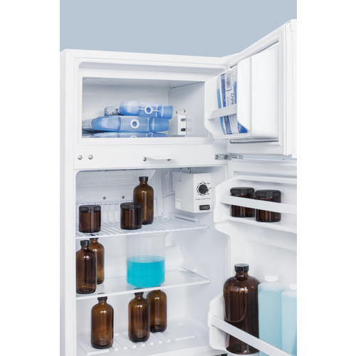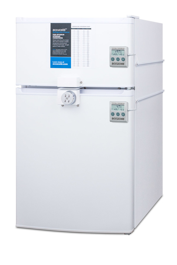 The CP351WLLF2PLUS2ADA is a two-door compact refrigerator-freezer designed for freestanding use, with a 32 1/2" height for use in facilities complying with ADA guidelines. It comes in a white textured finish with a slim 19" width ideal for space-limited settings. A single combination lock (with key override) secures both the refrigerator and freezer sections. The CP351WLLF2PLUS2ADA utilizes an innovative dual evaporator cooling system to separately cool the refrigerator while maintaining a low temperature in the freezer. Cycle defrost provides automatic defrost of the refrigerator to save users on regular maintenance and static manual defrost operation in the freezer section to prevent constant temperature fluctuation. All Accucold PLUS2 Series units include NIST calibrated thermometers that display the current, high, and low temperature in Celsius or Fahrenheit to the nearest tenth of a degree. The buffered temperature probe is stored in a glycol-filled bottle to ensure the temperature reading best reflects the temperature of other stored refrigerator contents. With its advanced cooling system and two-door design, the CP351WLLF2PLUS2ADA is a great choice for general purpose storage with added temperature assurance. Accucold's PLUS2 series refrigerators are intended for a wide variety of basic storage only. Storage of high-value vaccines, life science materials, medical, or clinical biologicals require a product with design features including, but not limited to tighter temperature controls, monitoring, and/or back-up. Note: This product is intended for a wide variety of basic storage applications. Storage of high-value vaccines, life science materials, and medical/clinical biologicals require a product offering tighter temperature control and/or alarms, monitoring, and backup. For more information, browse Accucold's purpose-built line or contact our product specialists at 1-888-4-MED-LAB.