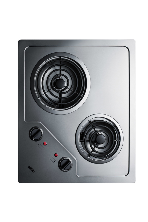 Summit offers a quality lineup of electric cooktops designed to suit any residential or hotel kitchen setup. The CR2B122 is a 120V cooktop made from attractive stainless steel. This unit is designed to fit many common counter cutouts sized 20" x 16". The burners and knobs are specially laid out so that they are easy and intuitive to use when the unit is installed in a landscape or portrait configuration. This unit features a large 7" 900W coil element and a 5 1/2" 500W coil element, letting you accommodate a variety of sizes. Additional safety features include indicator lights and push-to-turn knobs. With its innovative design and quality construction, the CR2B122 brings modern convenience to a classic cooktop size.