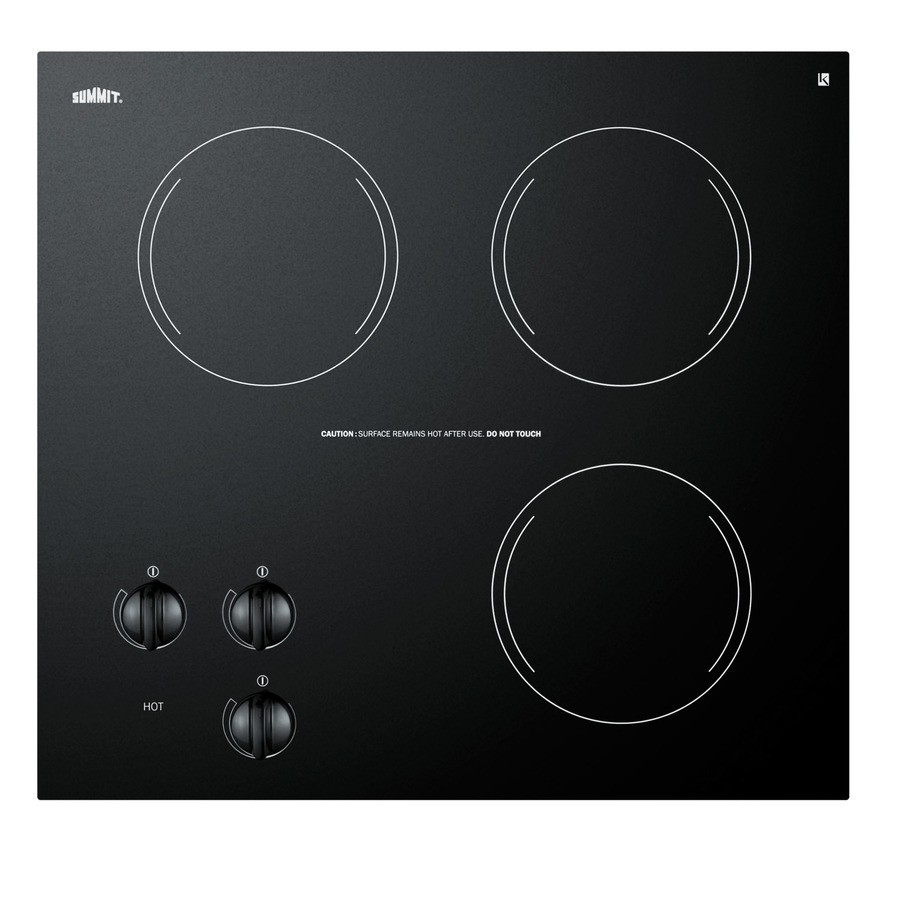 SUMMIT CR3240 is a three-burner 230V electric cooktop that brings outstanding value to kitchen counters. Made from Eurokera ceramic glass, the CR3240 offers modern style and convenience with an easy-to-clean jet black cooking surface. Three 1200W radiant elements feature a 6" diameter, manufactured by E.G.O. in Germany. Push-to-turn control knobs provide infinite heat control. A residual heat light indicates when the surface is still hot. This unit is made in Europea and designed to fit counter cutouts that are 19 7/8" wide by 18 3/8" long. Also available with one and two burners, SUMMIT CR electric cooktop series offers top performance in a quality design.
