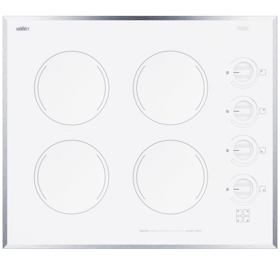 SUMMIT introduces a new series of smooth-top electric cooktops sized for 24" wide kitchen counter spaces, all made in the USA with the industry's best elements. The CR424WH is a 220V cooktop featuring four 1200W burners made by E.G.O. in Germany. The smooth white ceramic glass surface is constructed from Schott Ceran for long-lasting durability, easy cleanup, and sleek kitchen style. An elegant trim in 304 grade stainless steel completes the look. Sized for 24" wide countertop spaces, the CR424WH fits many common cutout sizes. This unit is also available in a black glass finish (see the CR424BL).