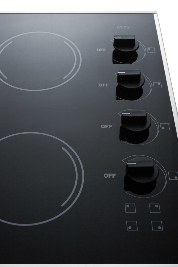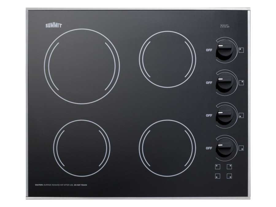SUMMIT introduces a new series of smooth-top electric cooktops sized for 24" wide kitchen counter spaces, all made in the USA with the industry's best elements. The CR425BL is a 230V 5400W cooktop, with all burner elements made by E.G.O in Germany. This unit includes one large 8" 1800W element to accommodate large cooking vessels and three 1200W 6 1/2" burners to meet most heating needs. Push-to-turn safety knobs offer added safety, with an attractive black finish to complete the look. Each burner includes an indicator light. The smooth surface is made from ceramic Schott glass in a jet black finish, offering easier cleanup than traditional coil elements. The unit is finished with a sleek trim in 304 grade stainless steel for added durability. The CR425BL is designed to fit common cutouts sized at 22 1/8" W x 18 5/8" D Designed and manufactured in the USA, the CR425BL is the perfect way to finish any small kitchen space.