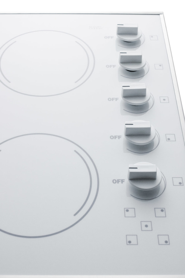 SUMMIT introduces a new series of smooth-top electric cooktops sized for unique kitchen counter spaces, all made in the USA with the industry's best elements. The CR5B274W is a 230V 6600W cooktop, with all burner elements made by E.G.O in Germany. This unit includes one large 8" 1800W element located in the center to accommodate large cooking vessels. Four standard 1200W 6 1/2" burners meet most heating needs. Push-to-turn knobs offer added safety, with an attractive matte white finish to complete the look. Each burner includes an indicator light. The smooth surface is made from ceramic Schott glass in a classic white finish, offering easier cleanup than traditional coil elements. The unit is finished with a sleek trim in 304 grade stainless steel for added durability. Sized with an exterior width of 27" and a conveniently shallow 20 1/2" depth, the CR5B274W can fit in cutouts 25 1/4" W x 18 3/4" deep. Designed and manufactured in the USA, the CR5B274W is the perfect way to finish any small kitchen space. For this unit in a black glass finish, see the CR5B273B.