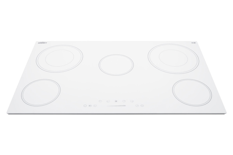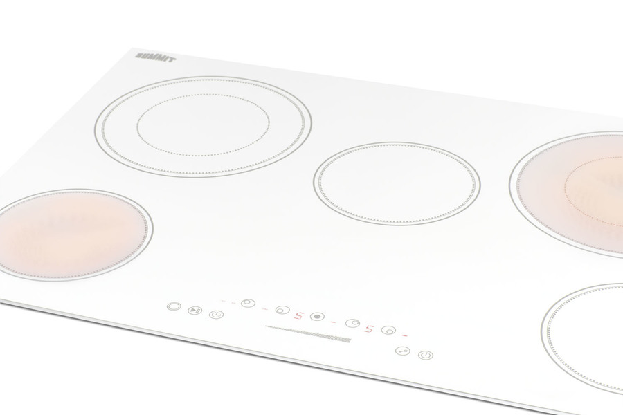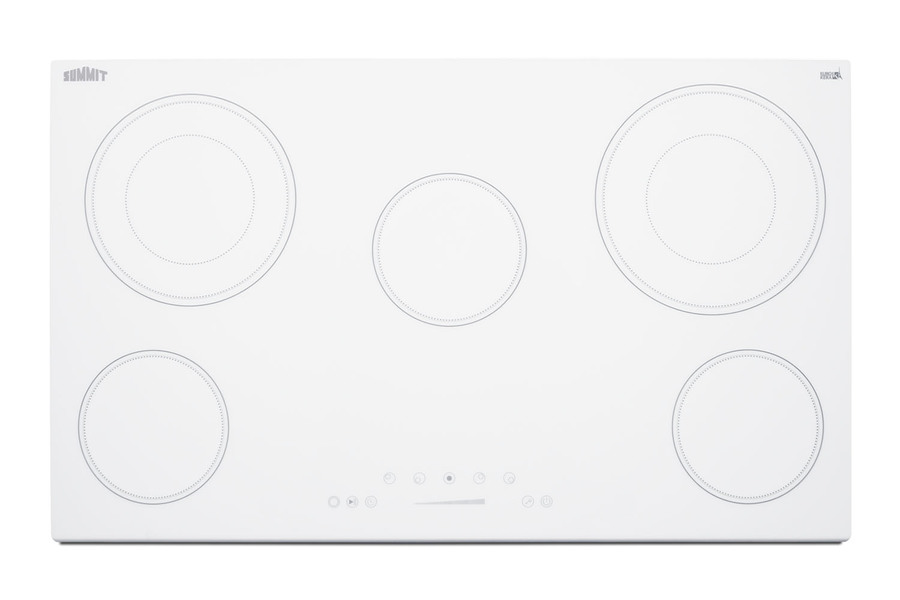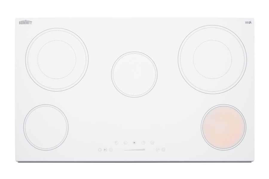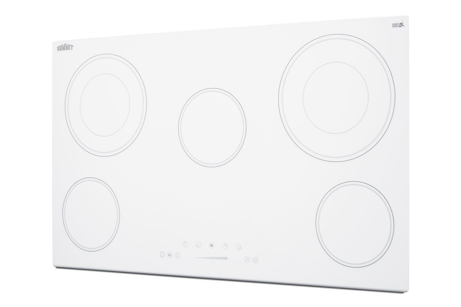 Summit's collection of smooth-top radiant cooktops includes fully featured models sized for standard kitchen counters, with user-friendly touch controls. The CR5B36TXW is a 36" wide 208-240V radiant cooktop designed to fit popular 34 3/4" W x 19 5/8" D counter cutouts. The surface is made from smooth EuroKera ceramic glass in a classic white finish for a durable, modern look. This unit does not ship with a power cord and must be hard-wired by a professional. Five elements let you meet a variety of cooking needs. The two extra large dual ring elements in the rear (2200W 9" element on the left and 3000W 9 3/4" element on the right) allow you to efficiently heat woks, Dutch ovens, and other large cooking vessels or to switch to the inner 5 1/2" elements as needed. The 6 1/2" 1200W front burners cover standard sizes, while the center 100W warming zone element lets you keep cookware heated without overcooking. The digital controls are centered upfront, ensuring users won't have to reach over hot burners to adjust the temperature. The intuitive touch design is easy to operate and clean. This unit also includes a timer function that lets you program a power level and cook time (up to 99 minutes) that can either turn the unit off when complete, or serve as a visual countdown with an audible alert when the set time has been reached. Safety features include a child lock function, automatic shutoff after two hours, and a residual heat indicator. With its attractive design, smartly designed burner configuration, and intuitive touch controls, the CR5B36TXW brings a user-friendly cooking performance with reliable safety to the kitchen. Additional choices are available in 24" and 30" wide sizes, as well as black glass finishes. Browse the full Summit lineup for more.