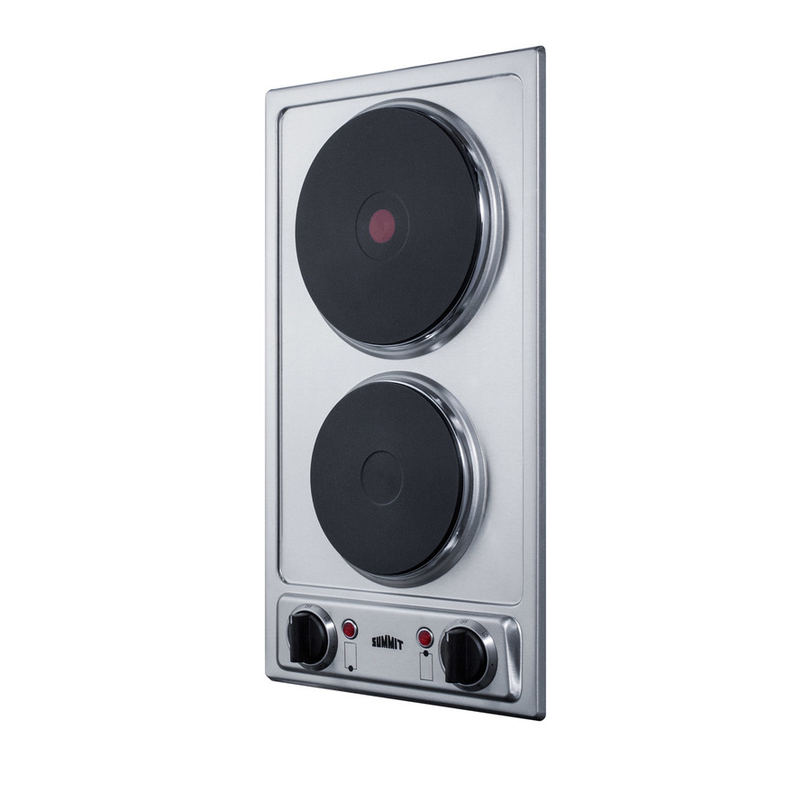 Summit's selection of electric cooktops offers the perfect fit for every application. Sized at 12" wide, the CSD2B230 is a 230V cooktop with two solid disk elements. The surface comes in brushed stainless steel for an attractive look built to last. The rear 2000W burner is sized with an 8" diameter to fit large cookware, while the front 1000W 6" element accommodates most general heating needs. The solid disk elements are constructed from cast iron, ensuring extreme durability. These elements also retain heat longer than traditional coil or glass top surfaces, making them ideal for keeping the contents in your pots and pans warmer before serving. Even heat distribution helps to improve your cooking results. This unit includes upfront push-to-turn knobs and an "on" indicator light for each burner for added safety. With its modern style and durable design, the CSD2B230 is a great choice for hotels, mobile homes, tiny houses, and other small kitchens with specific cooking needs. This is a 230V cooktop that requires professional installation. For a 4-burner version, see the CSD4B24.