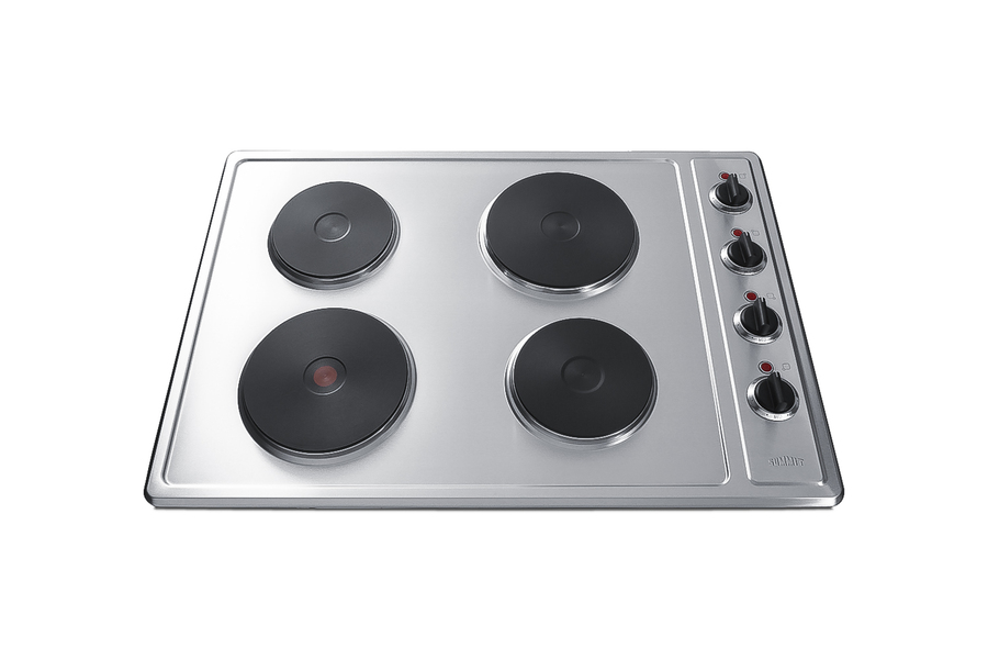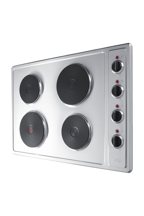 Summit's selection of electric cooktops offers the perfect fit for every application. Sized at 30" wide, the CSD4B300 is a 230V cooktop with four solid disk elements. The surface comes in brushed stainless steel for an attractive look built to last. The element located in the front left side is 8" wide, with 2000W of cooking power ideal for larger cookware. The rear 1500W 8" element also accommodates full-sized pots and pans, while two 1000W 6" heating elements meet most general heating needs. The solid disk elements are constructed from cast iron, ensuring extreme durability. These elements also retain heat longer than traditional coil or glass top surfaces, making them ideal for keeping the contents in your pots and pans warmer before serving. Even heat distribution helps to improve your cooking results. This unit includes push-to-turn knobs and an "on" indicator light for each burner for added safety. With its modern style and durable design, the CSD4B300 is a great choice for hotels, mobile homes, tiny houses, and other small kitchens with specific cooking needs. This is a 230V cooktop that requires professional installation. Additional sizes are available in solid disk, as well as traditional radiant, coil, induction, and gas. Browse the full Summit product line to explore your options.
