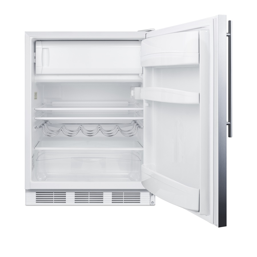 Summit's Peak24 series of undercounter European-made refrigeration features energy efficient refrigerator-freezer choices that offer the largest capacity in the industry for recessed installation in 24" openings. Sized with a 24” footprint, the ENERGY STAR certified CT661WSSHV refrigerator-freezer offer a generous 5 cu.ft. storage capacity, larger than many units in this size class. It features a white cabinet with a stainless steel wrapped door. A sleek handle in brushed stainless steel completes the professional look. Inside, the CT661WSSHV features a dual evaporator to allow separated cooling of the fresh and frozen food sections. The refrigerated compartment utilizes low maintenance automatic defrost, while the interior freezer compartment is manual defrost to achieve lower storage temperatures ideal for ice cream and other frozen food. The deluxe interior includes adjustable glass shelves for spill-proof storage and easier cleaning, as well as a scalloped wine shelf to hold wine and champagne bottles safely in place. Door racks offer additional convenience for tall bottles and condiments and a clear crisper drawer ensures your produce is stored under the ideal conditions. This model includes automatic interior lighting and an adjustable dial thermostat. The CT661WSSHV is UL listed for residential use. With its large capacity and user-friendly features, this unit is a convenient option for homes, offices, schools, and other settings in need of reliable cold storage. Additional choices are available in ADA compliant height. Browse the full Summit catalog to discover the perfect appliance for your refrigeration needs.