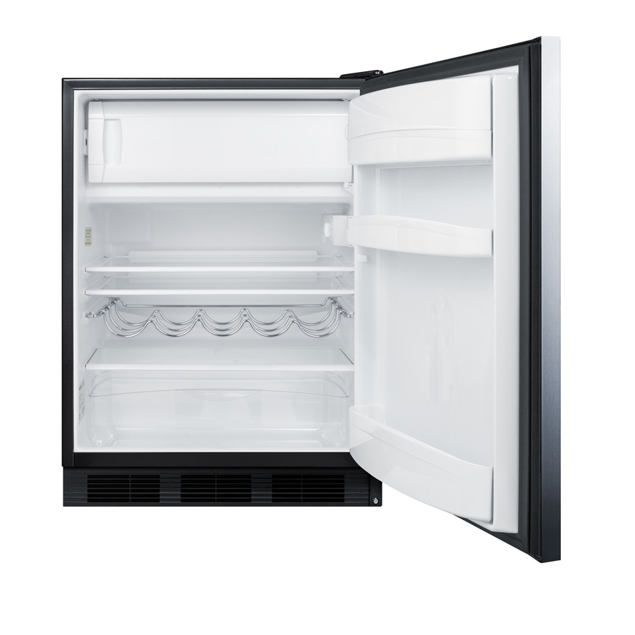 Summit's Peak24 series of undercounter European-made refrigeration features energy efficient refrigerator-freezer choices that offer the largest capacity in the industry for recessed installation in 24" openings. Sized with a 24” footprint, the ENERGY STAR certified CT663BKSSHH refrigerator-freezer offer a generous 5 cu.ft. storage capacity, larger than many units in this size class. It features a black cabinet with a reversible stainless steel wrapped door. A sleek handle in brushed stainless steel completes the professional look. Inside, the CT663BKSSHH features a dual evaporator to allow separated cooling of the fresh and frozen food sections. The refrigerated compartment utilizes low maintenance automatic defrost, while the interior freezer compartment is manual defrost to achieve lower storage temperatures ideal for ice cream and other frozen food. The deluxe interior includes adjustable glass shelves for spill-proof storage and easier cleaning, as well as a scalloped wine shelf to hold wine and champagne bottles safely in place. Door racks offer additional convenience for tall bottles and condiments and a clear crisper drawer ensures your produce is stored under the ideal conditions. This model includes automatic interior lighting and an adjustable dial thermostat. The CT663BKSSHH is UL listed for residential use. With its large capacity and user-friendly features, this unit is a convenient option for homes, offices, schools, and other settings in need of reliable cold storage. Additional choices are available in ADA compliant height. Browse the full Summit catalog to discover the perfect appliance for your refrigeration needs.