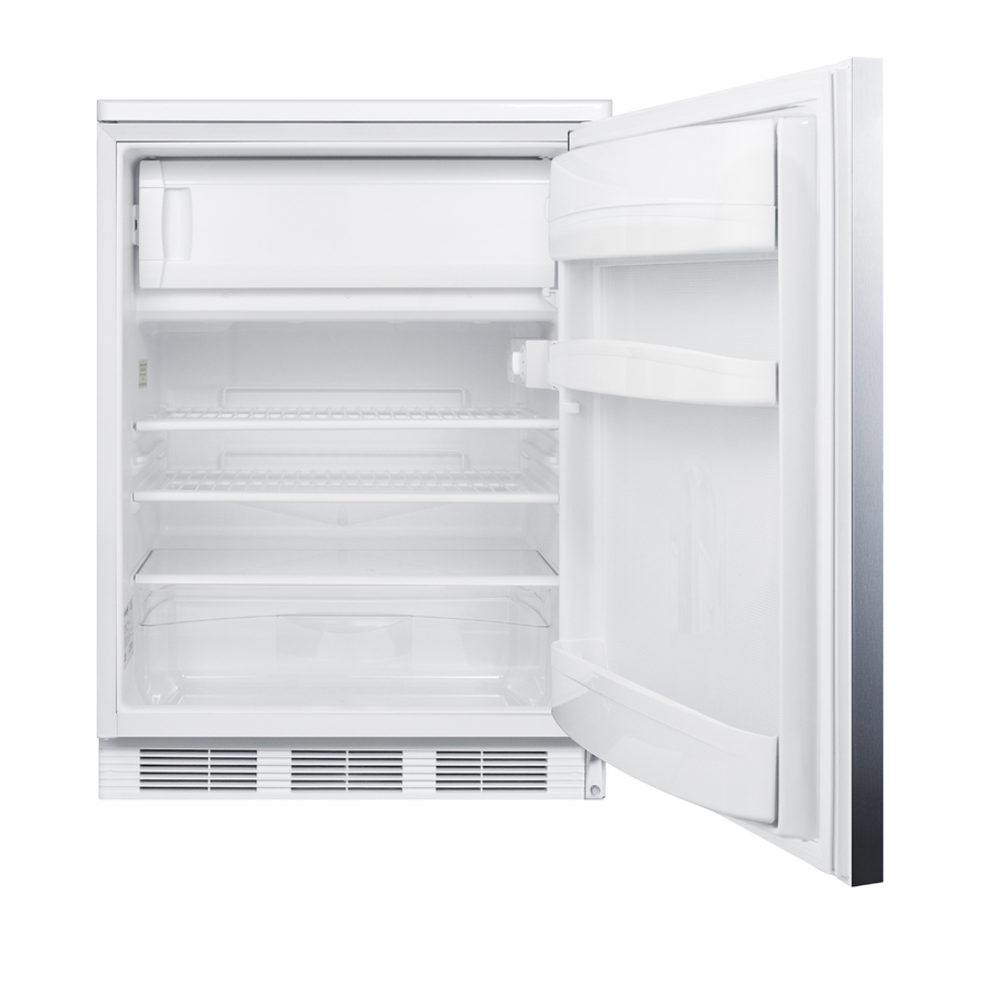 Accucold by Summit Appliance offers a wide range of undercounter refrigeration for general purpose storage. The CT66JBIADA Series includes refrigerator-freezers designed for optimum storage conditions in built-in applications under lower ADA compliant counters. At 32" high, the CT66LWBISSHHADA can be used built-in or freestanding in ADA compliant settings. The 24" footprint fits many popular cutouts while offering over 5 cu.ft. of storage capacity. This model has a white cabinet and reversible stainless steel wrapped door with a factory installed front lock. A thin handle is mounted horizontally to complete the sleek, modern look. Inside, our unique dual evaporator system separately cools the refrigerator and freezer sections to ensure proper storage temperature. Cycle defrost operation reduces user maintenance in the automatic defrost fresh food section, with static manual defrost operation in the freezer compartment. Door storage provides easy access for tall bottles and small condiments. Additional features include adjustable shelves, a clear crisper, and automatic interior lighting. The CT66LWBISSHHADA has long proven itself to have one of the best temperature performance records in the industry. To see additional finish options on this unit, browse the full CT66WBIADA Series. Note: This product is intended for a wide variety of basic storage applications. Storage of high-value vaccines, life science materials, and medical/clinical biologicals require a product offering tighter temperature control and/or alarms, monitoring, and backup. For more information, browse Accucold's purpose-built line or contact our product specialists at 1-888-4-MED-LAB.